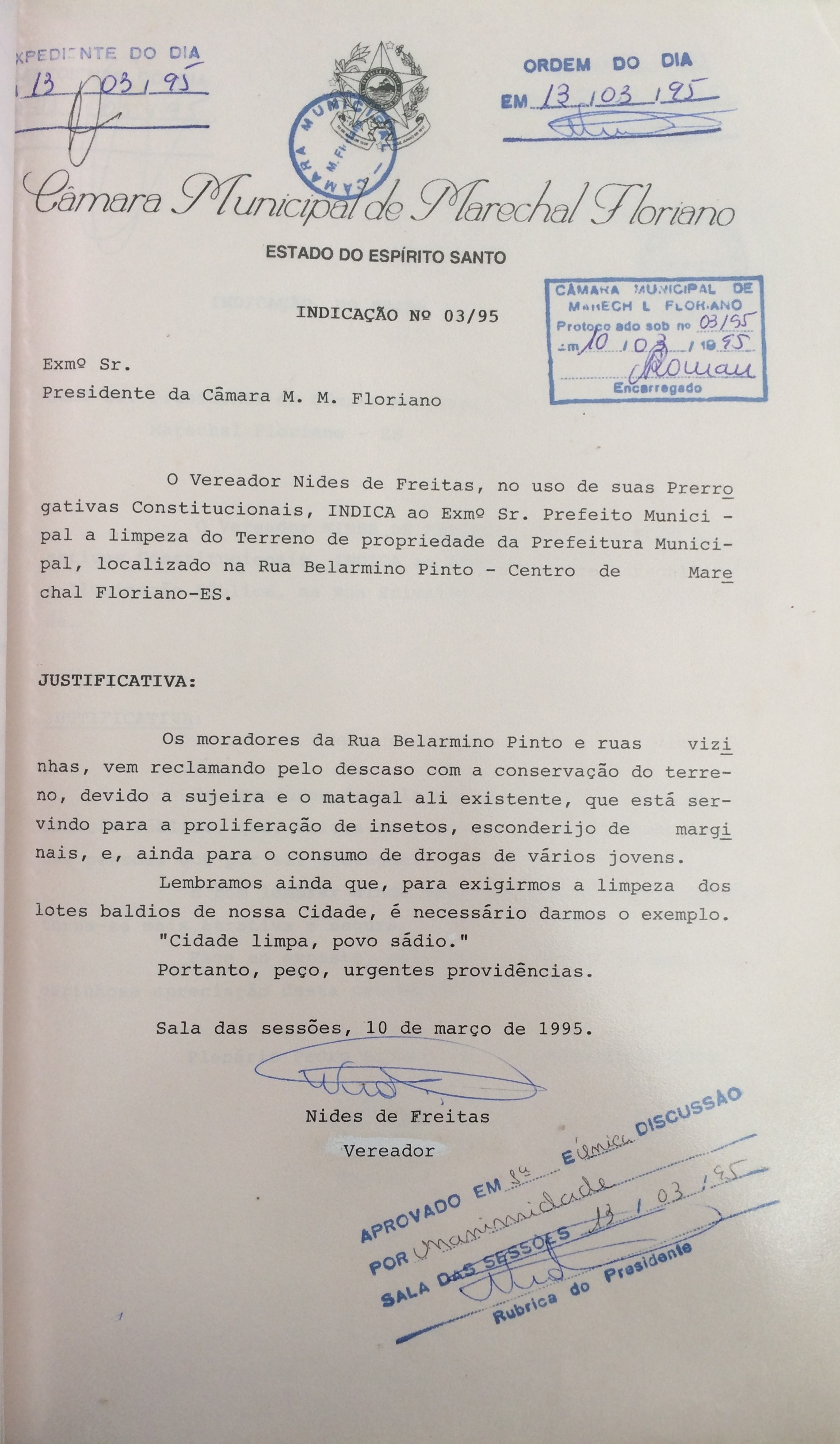 Ementa: INDICA A LIMPEZA DO TERRENO DE PROPRIEDADE DA PREFEITURA MUNICIPAL, LOCALIZADO NA RUA BELARMINO PINTO - CENTRO DE MARECHAL FLORIANO-ES.