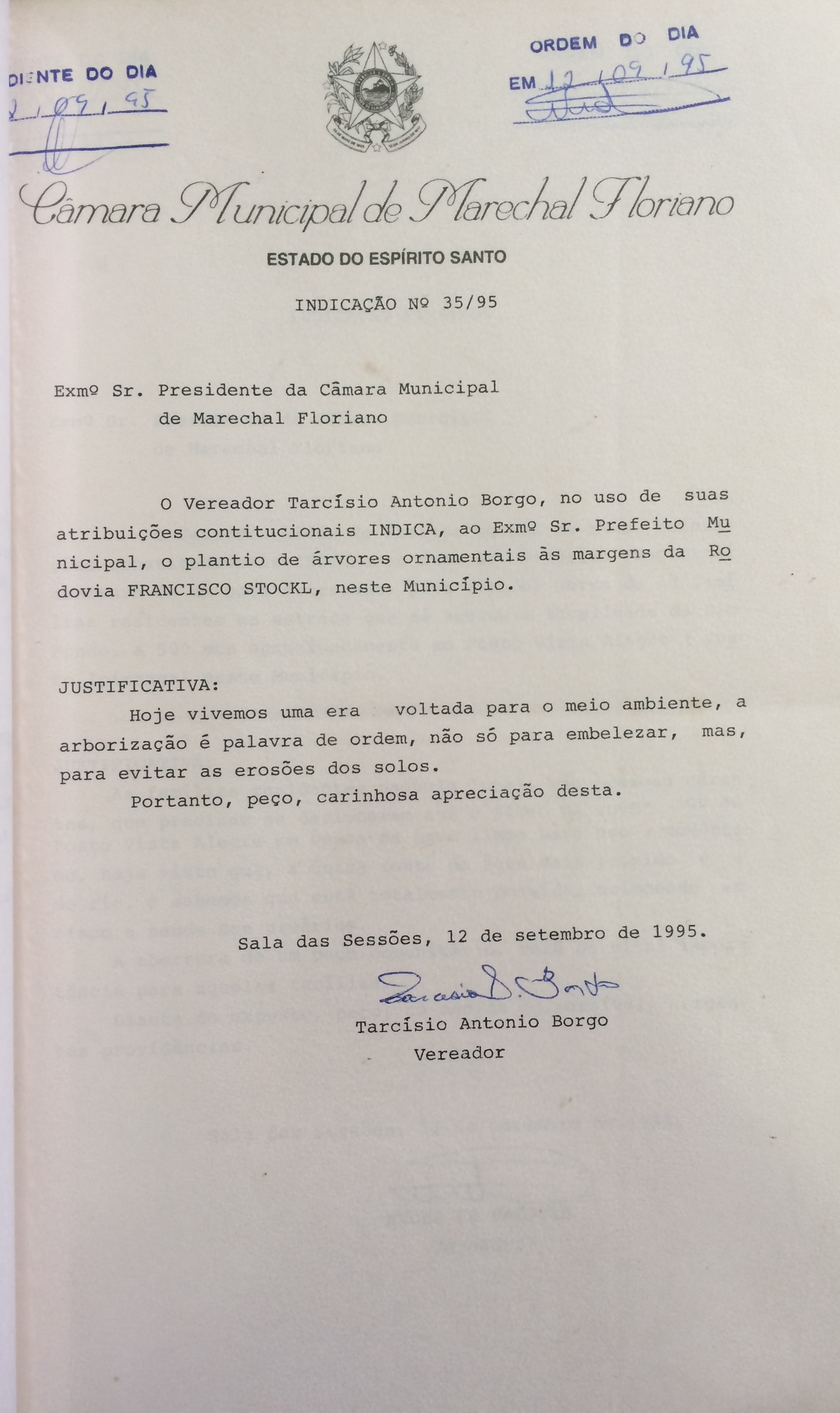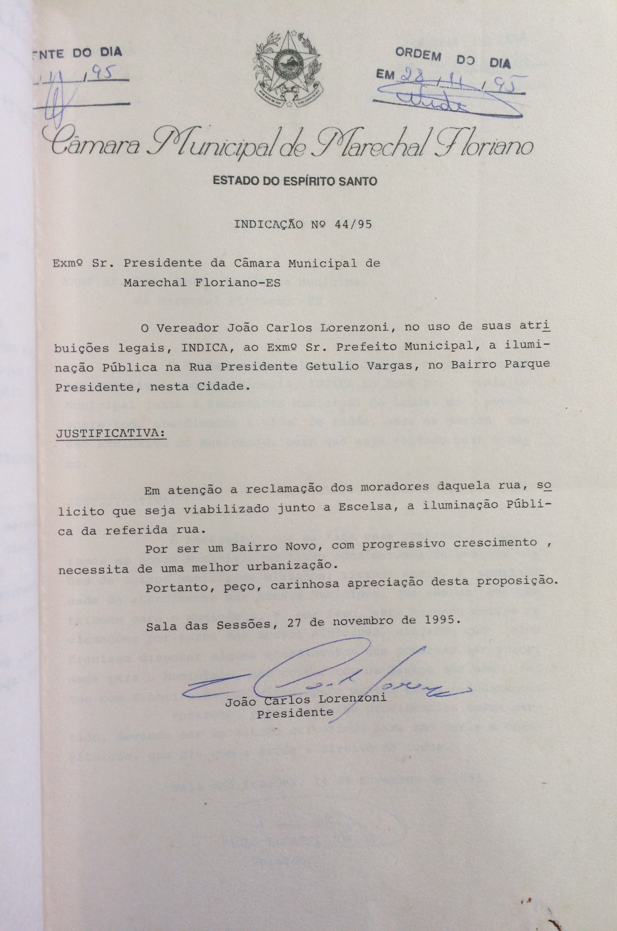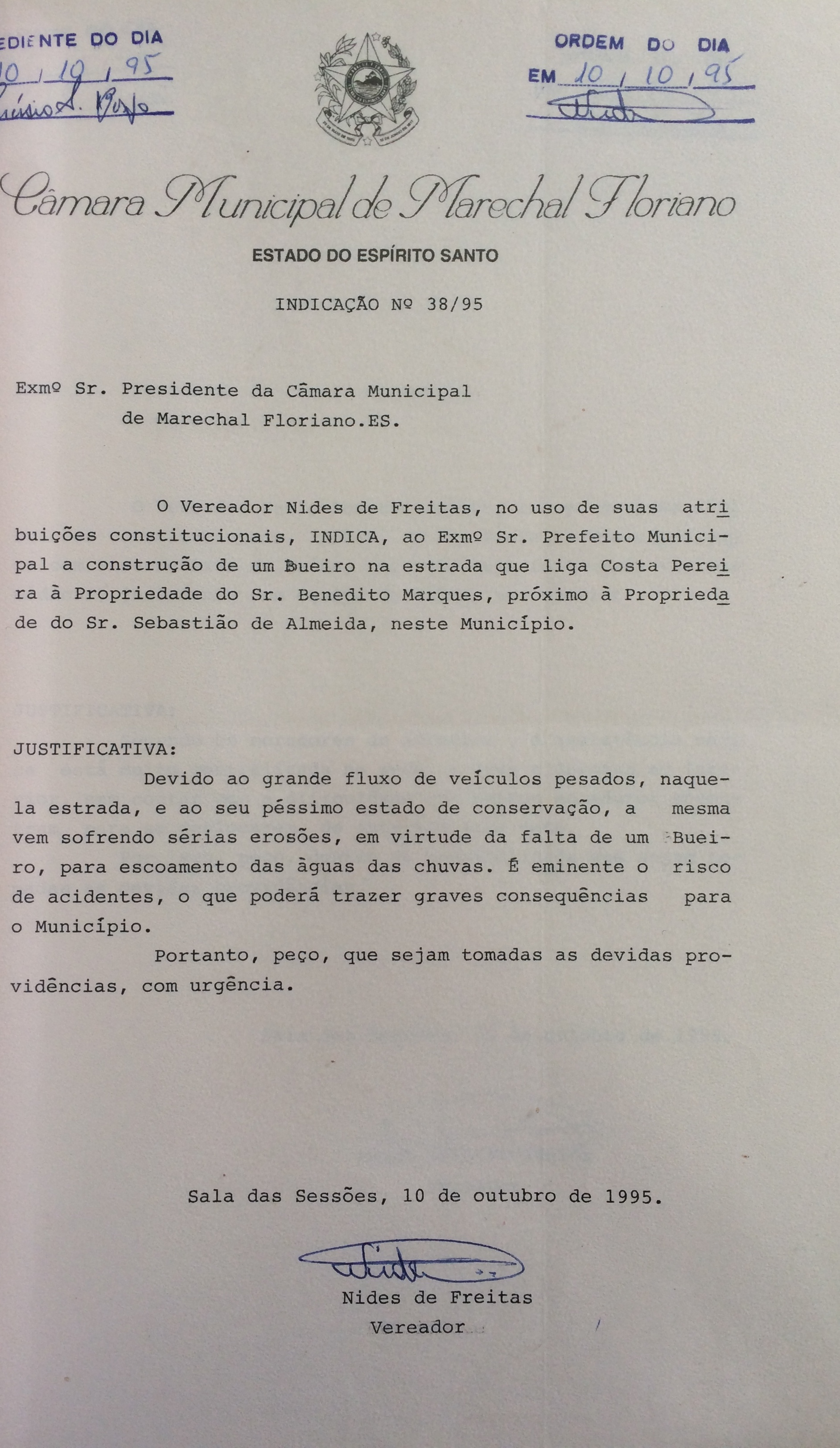 Ementa: PARECER REFERENTE À "ENTRA EM PAUTA NESTA DATA, O PROJETO DE LEI Nº 14/95, DE AUTORIA DO VEREADOR NIDES DE FREITAS, ORIGINALMENTE SUBSCRITO EM DATA DE 10 DE MARÇO DE 1995, QUE "DÁ NOME DE RUA JOÃO MERISIO A RUA PROJETADA, NO CENTRO DA CIDADE DE MARECHAL FLORIANO-ES""