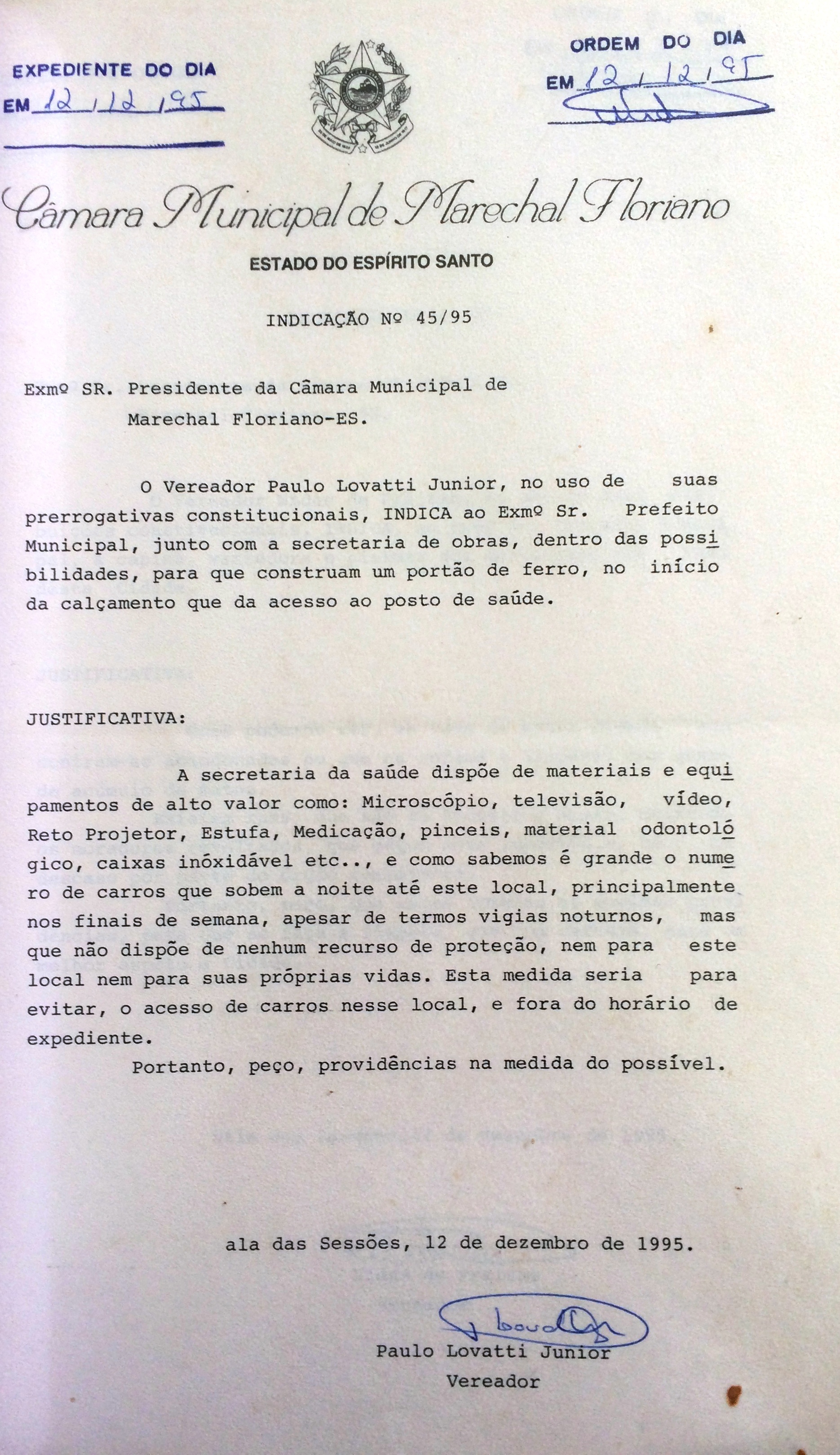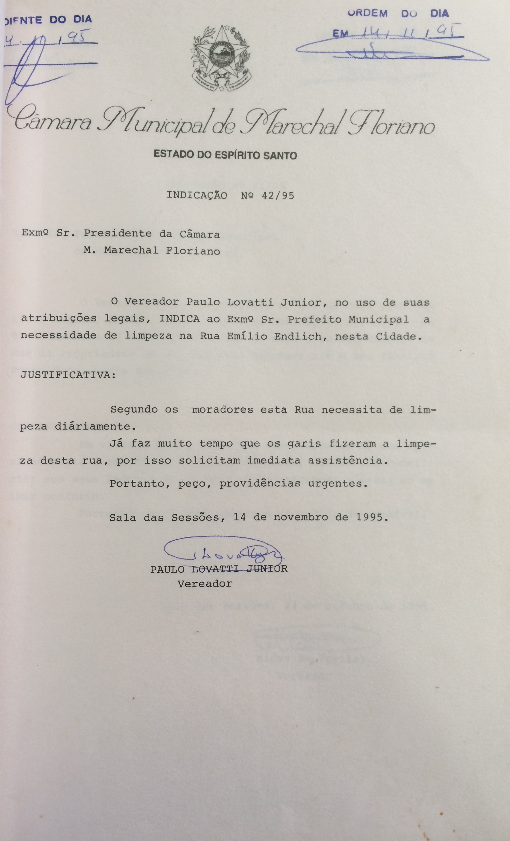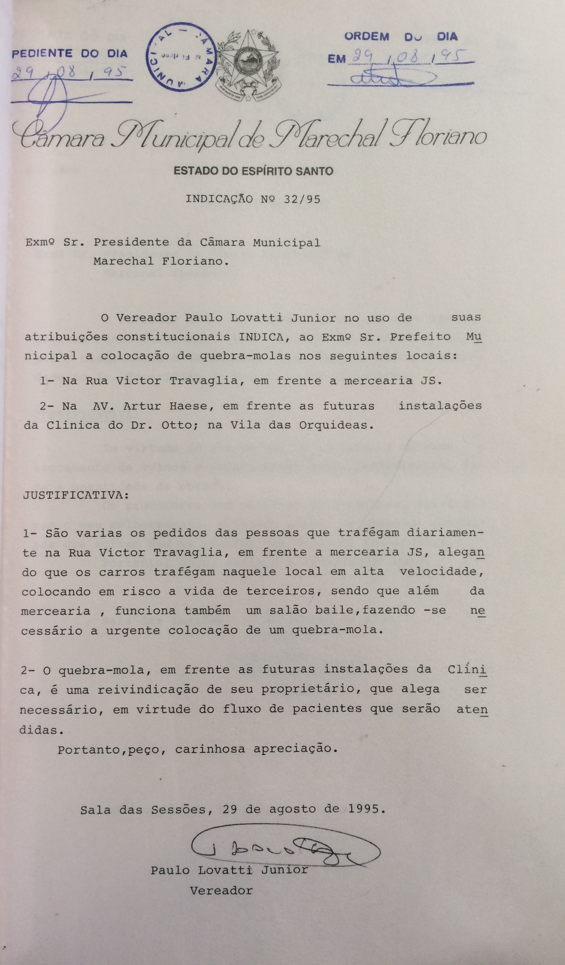 Ementa: PARECER REFERENTE À "ENTRA EM PAUTA NESTA DATA, O PROJETO DE LEI Nº 14/95, DE AUTORIA DO VEREADOR NIDES DE FREITAS, ORIGINALMENTE SUBSCRITO EM DATA DE 10 DE MARÇO DE 1995, QUE "DÁ NOME DE RUA JOÃO MERISIO A RUA PROJETADA, NO CENTRO DA CIDADE DE MARECHAL FLORIANO-ES""