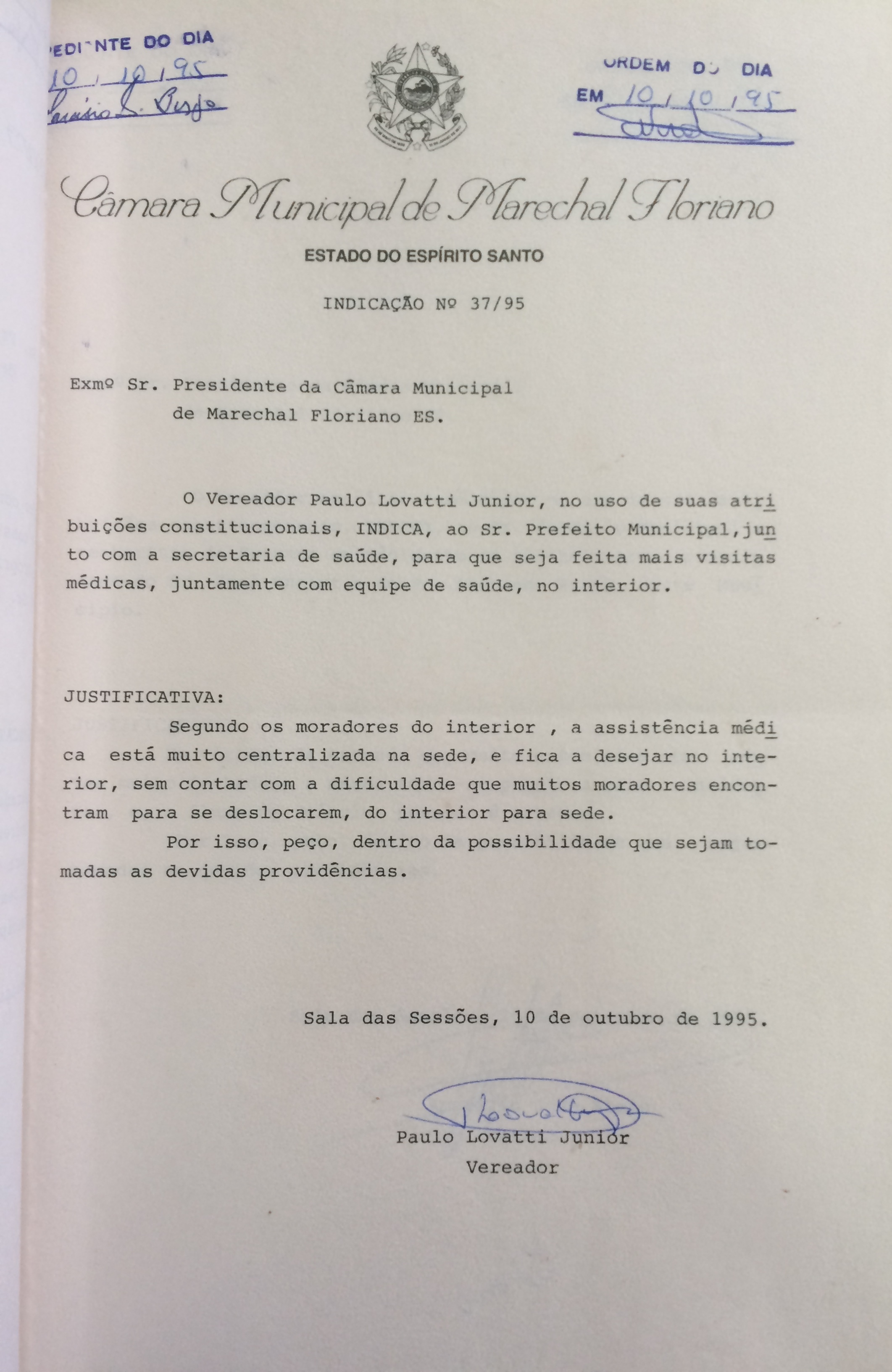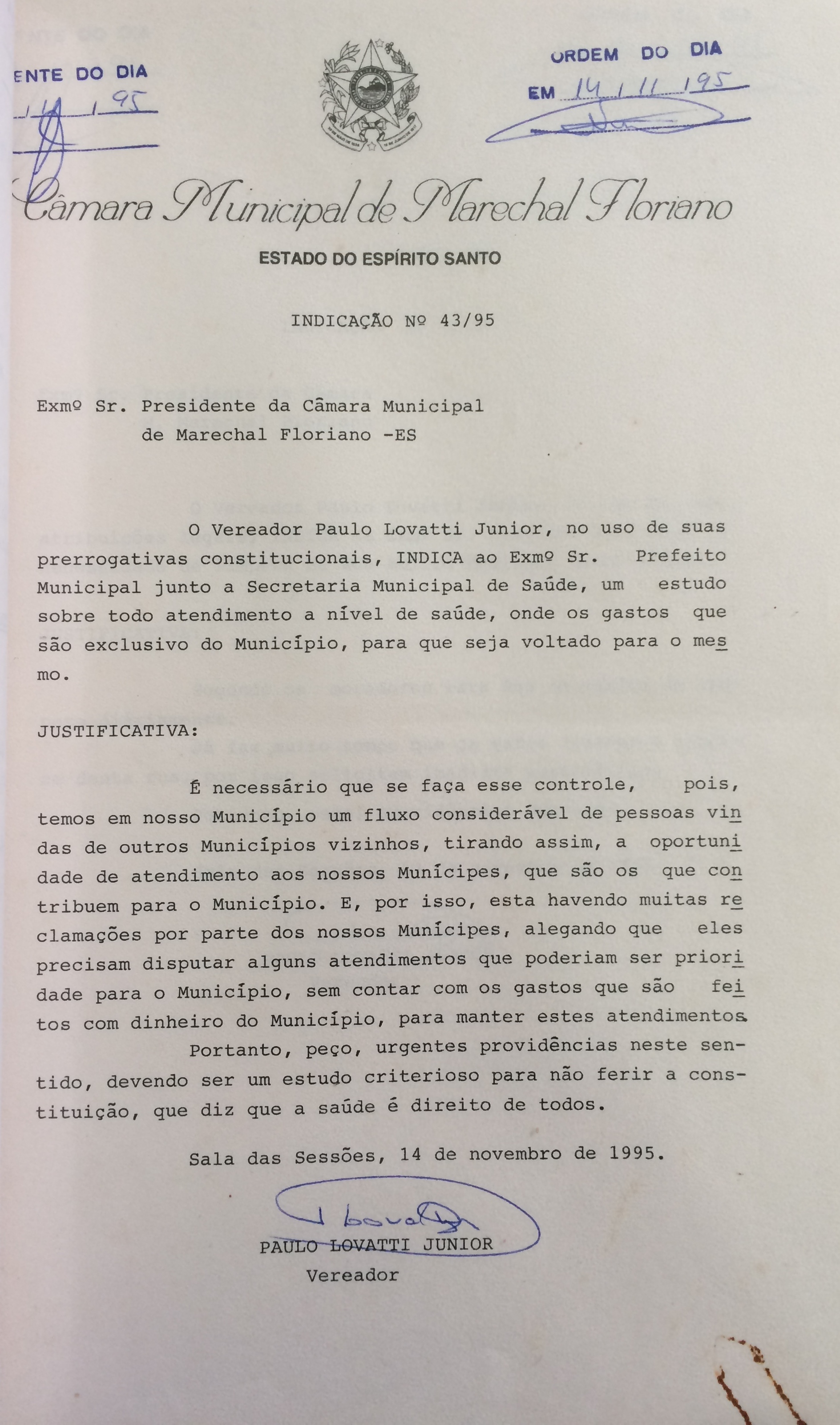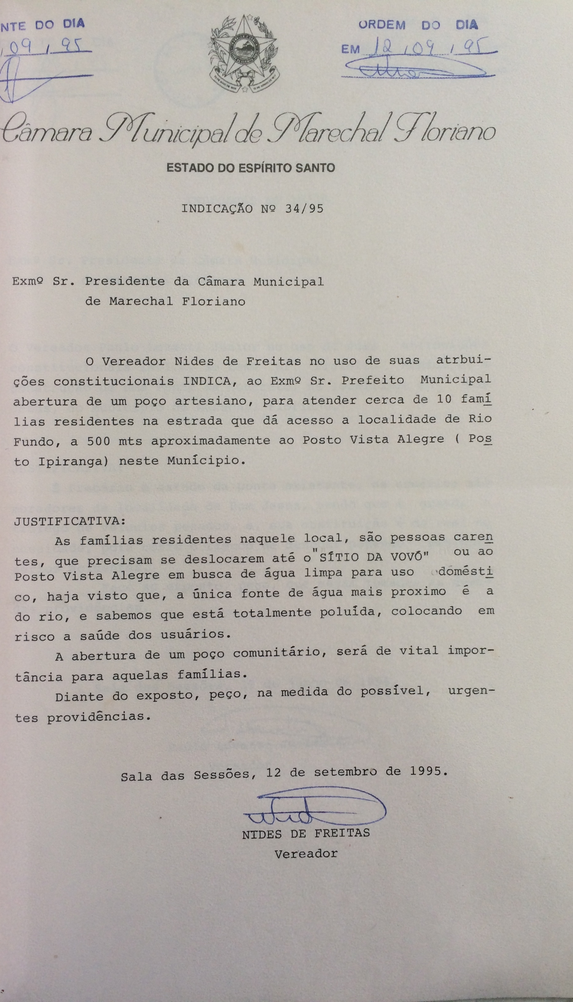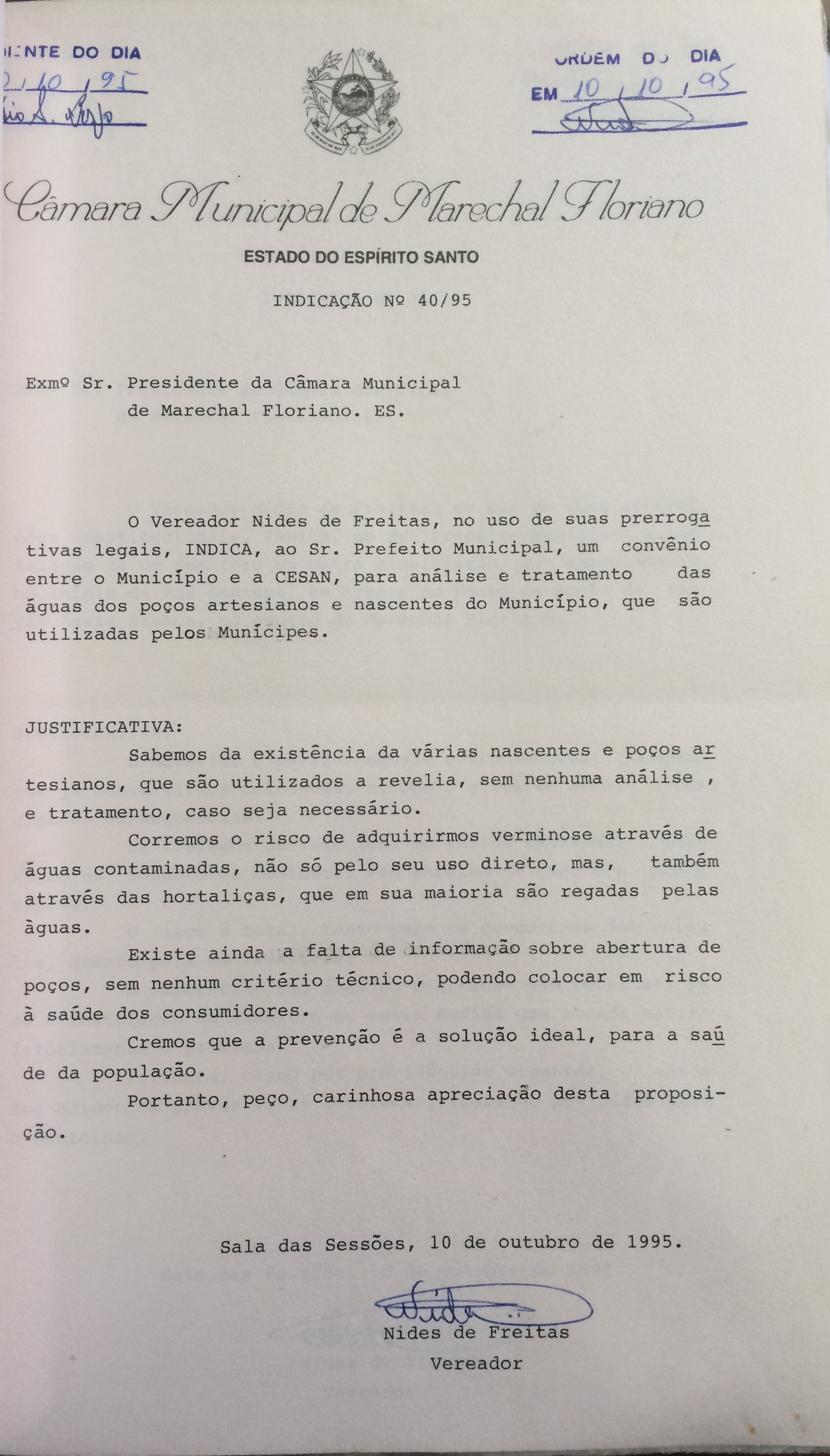 Ementa: INDICA UM CONVÊNIO ENTRE O MUNICÍPIO E A CESAN, PARA ANÁLISE E TRATAMENTO DAS ÁGUAS DOS POÇOS ARTESIANOS E NASCENTES DO MUNICÍPIO, QUE SÃO UTILIZADOS PELOS MUNÍCIPES.