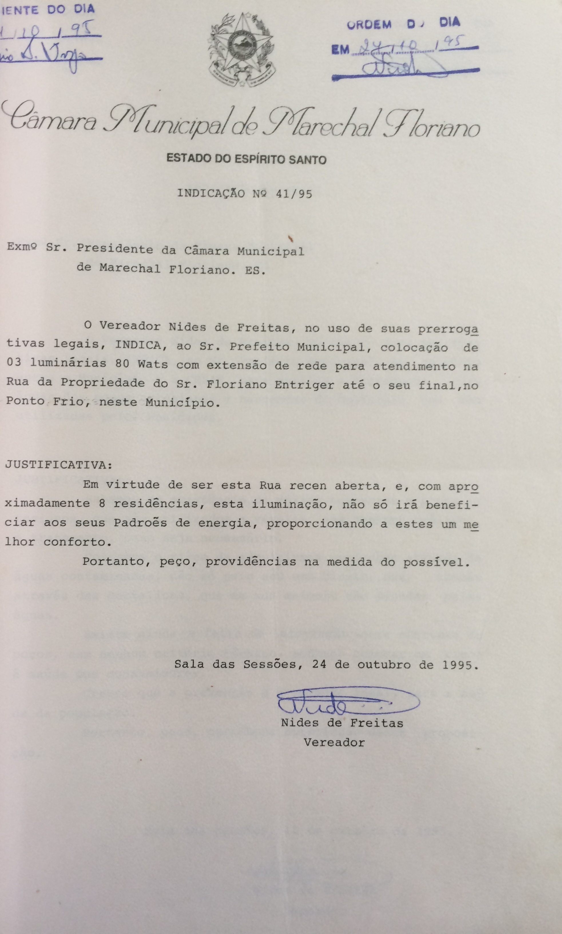 Ementa: INDICA COLOCAÇÃO DE 03 LUMINÁRIAS 80 WATS COM EXTENSÃO DE REDE PARA ATENDIMENTO NA RUA DA PROPRIEDADE DO SR. FLORIANO ENTRINGER ATÉ O SEU FINAL, NO PONTO FRIO, NESTE MUNICÍPIO.