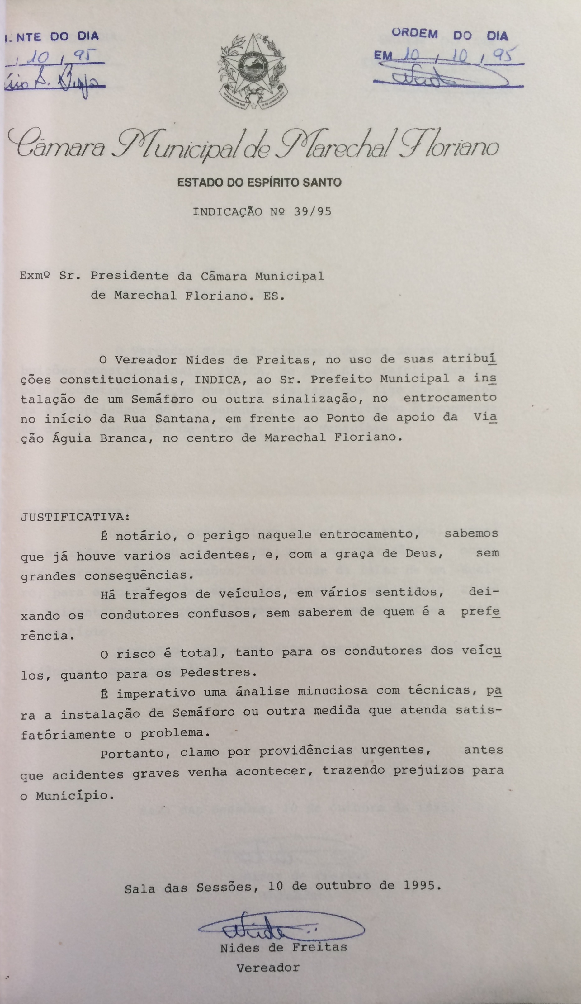 Ementa: INDICA A INSTALAÇÃO DE UM SEMÁFORO OU OUTRA SINALIZAÇÃO, NO ENTROCAMENTO NO INICIO DA RUA SANTANA, EM FRENTE AO PONTO DE APOIO DA VIAÇÃO ÁGUIA BRANCA, NO CENTRO DE MARECHAL FLORIANO.