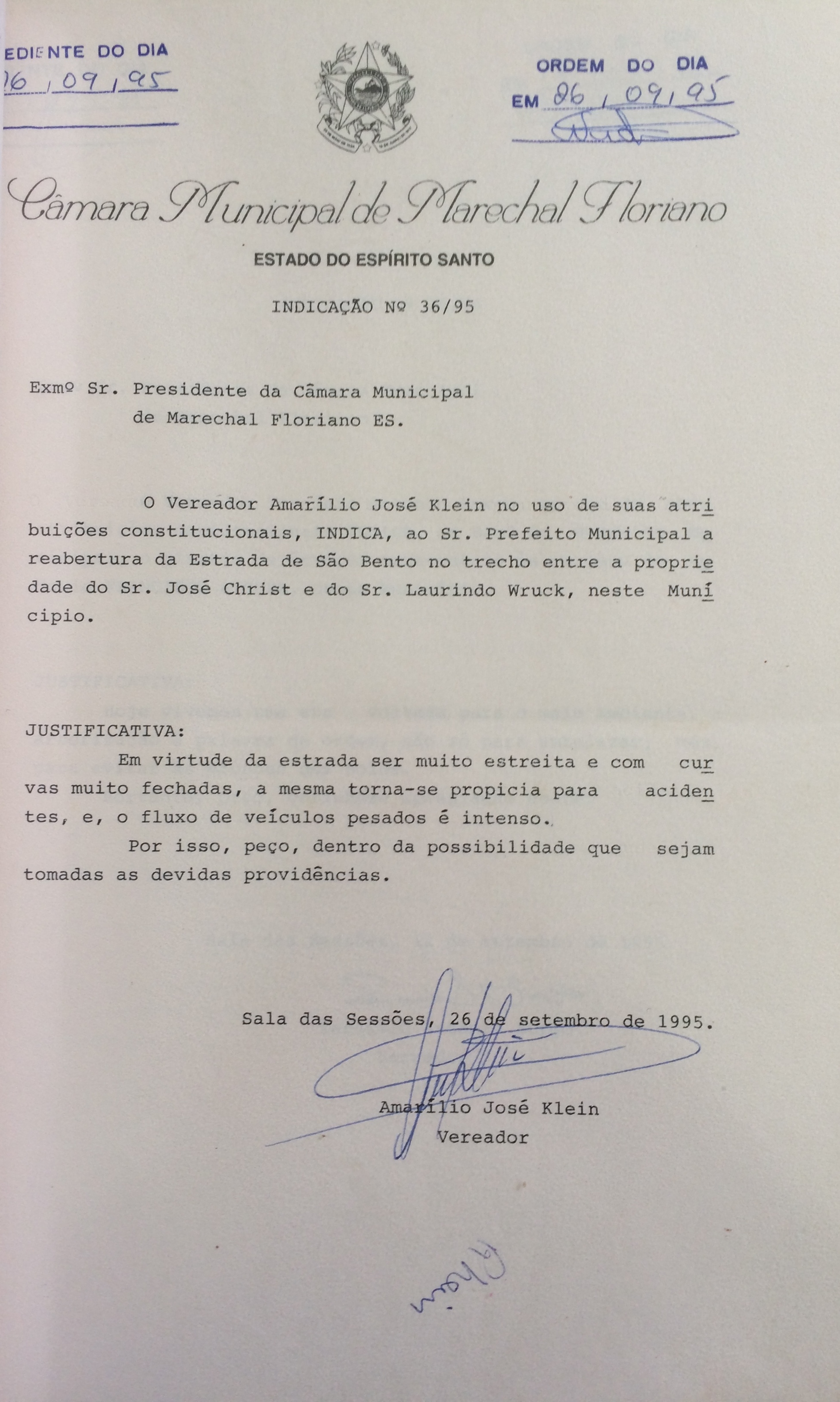 Ementa: INDICA A REABERTURA DA ESTRADA DE SÃO BENTO NO TRECHO ENTRE A PROPRIEDADE DO SR. JOSÉ CHRIST E DO SR. LAURINDO WRUCK, NESTE MUNICÍPIO.
