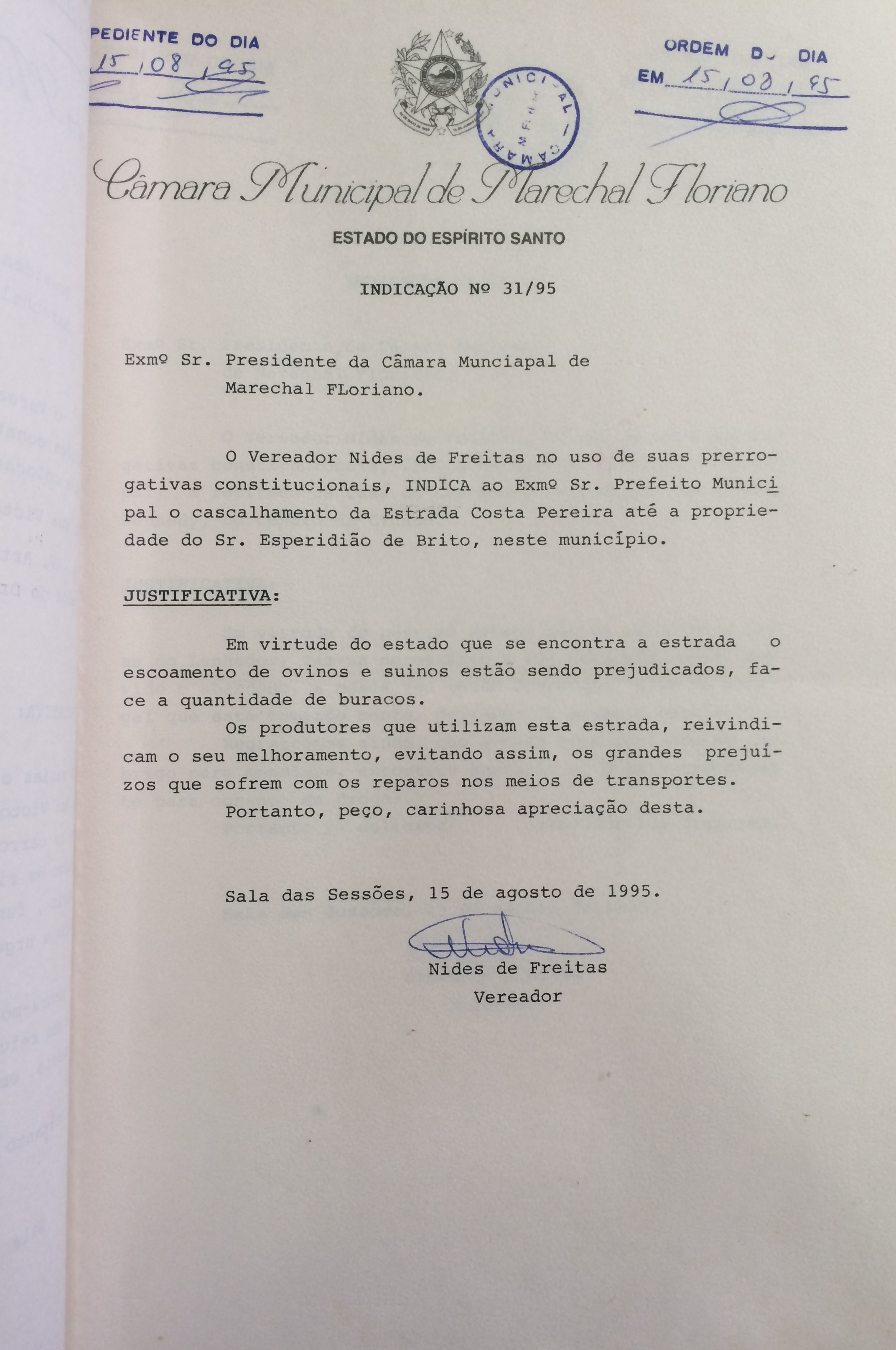 Ementa: INDICA O CASCALHAMENTO DA ESTRADA COSTA PEREIRA ATÉ A PROPRIEDADE DO SR. ESPERIDIÃO DE BRITO, NESTE MUNICÍPIO.