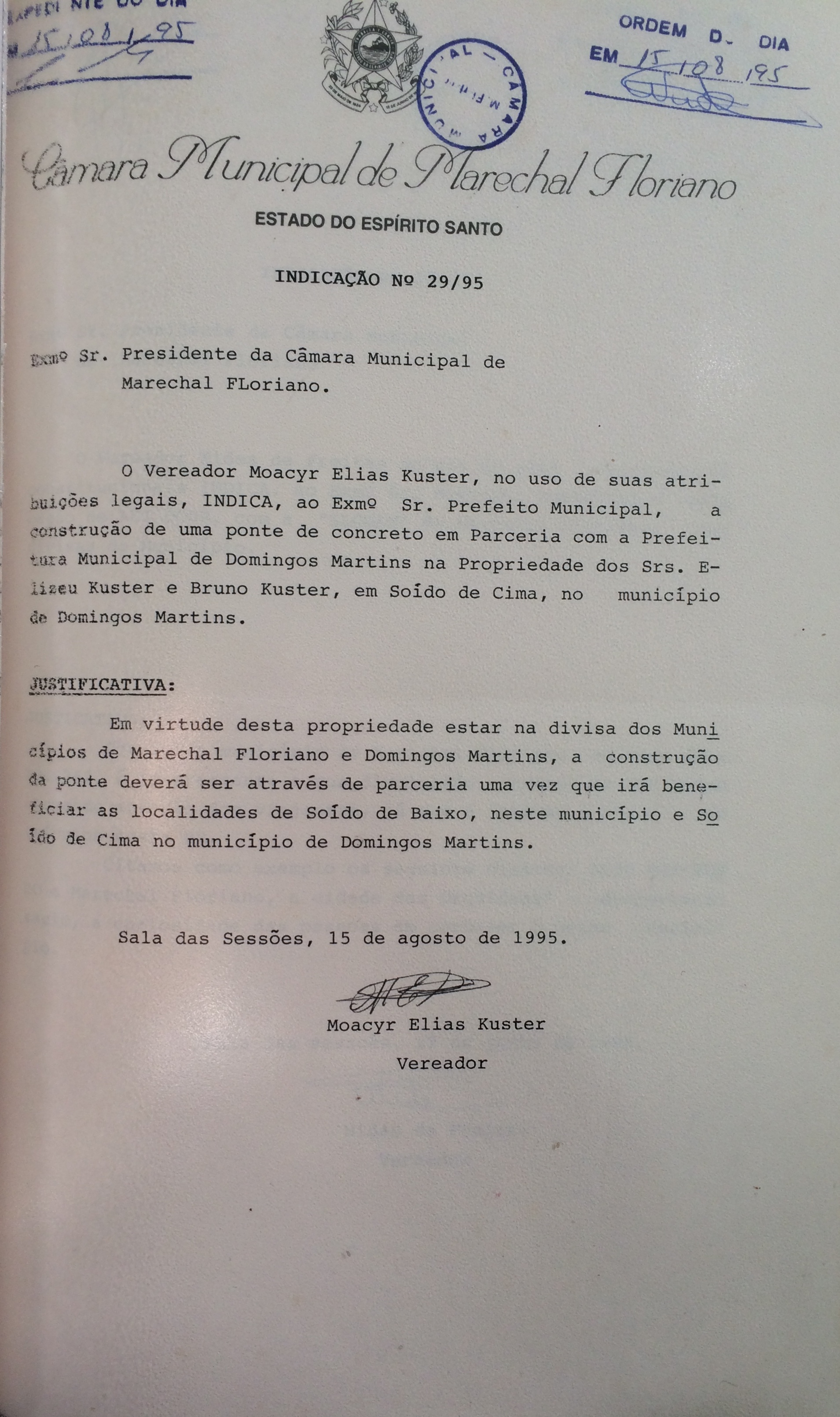 Ementa: INDICA A CONSTRUÇÃO DE UMA PONTE DE CONCRETO EM PARCERIA COM A PREFEITURA MUNICIPAL DE DOMINGOS MARTINS NA PROPRIEDADE DOS SRS. ELIZEU KUSTER E BRUNO KUSTER, EM SOÍDO DE CIMA, NO MUNICÍPIO DE DOMINGOS MARTINS.