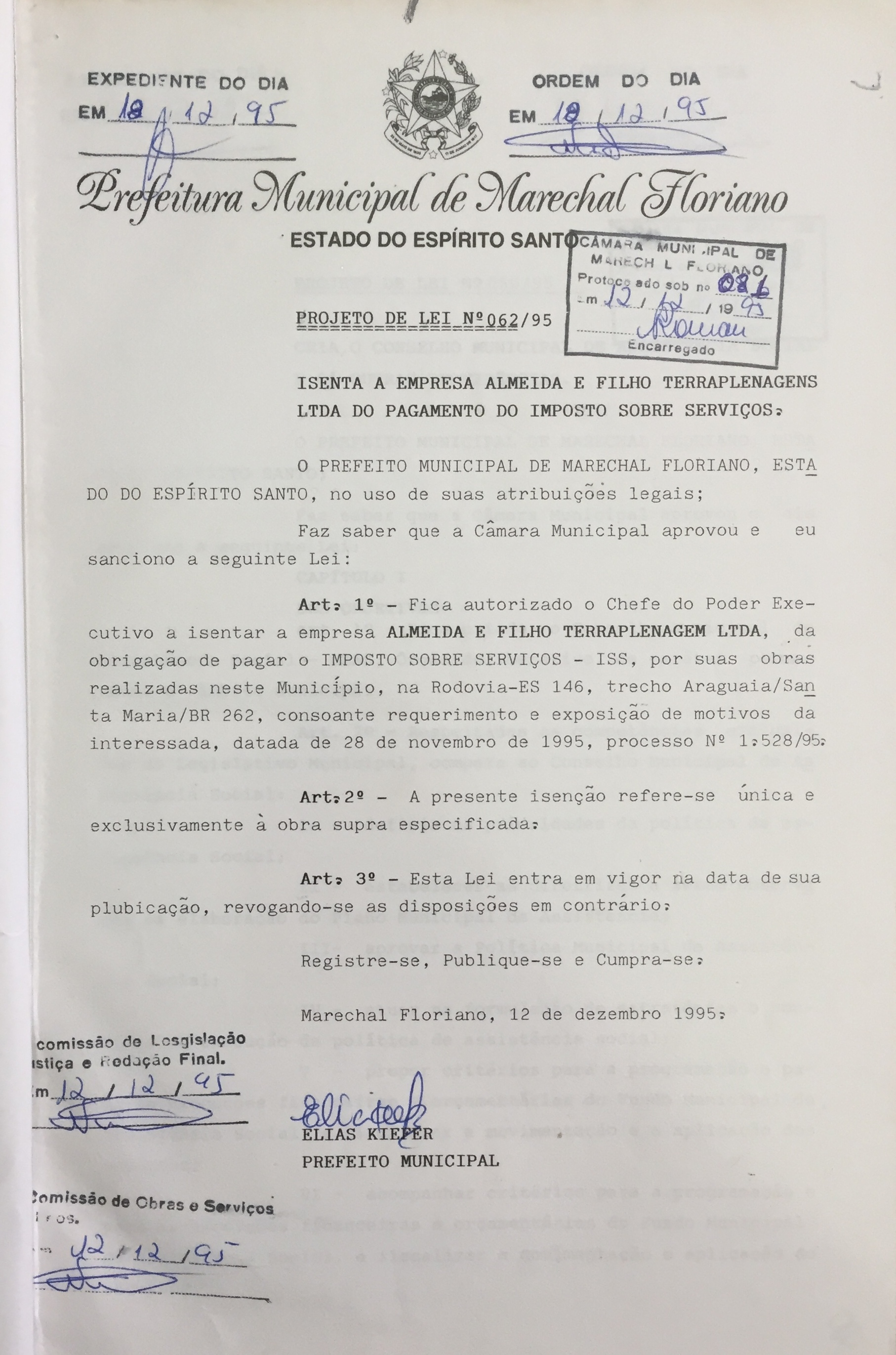 Ementa: ISENTA A EMPRESA ALMEIDA E FILHO TERRAPLENAGENS LTDA DO PAGAMENTO DO IMPOSTO SOBRE SERVIÇO.