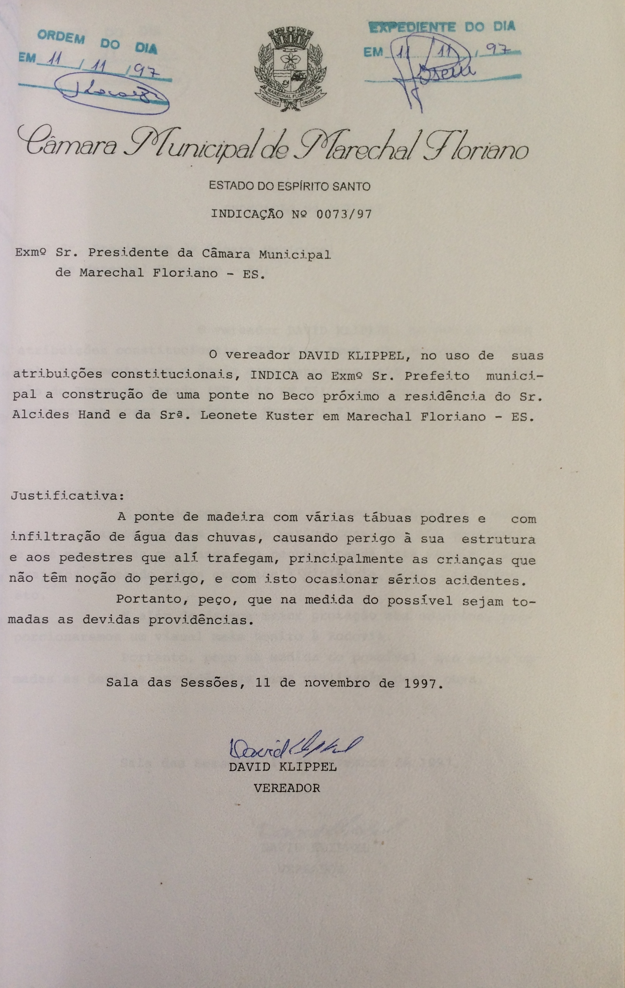 Ementa: INDICA A CONSTRUÇÃO DE UMA PONTE NO BECO PRÓXIMO A RESIDÊNCIA DO SR. ALCIDES HAND E DA SRª. LEONETE KUSTER EM MARECHAL FLORIANO-ES.
