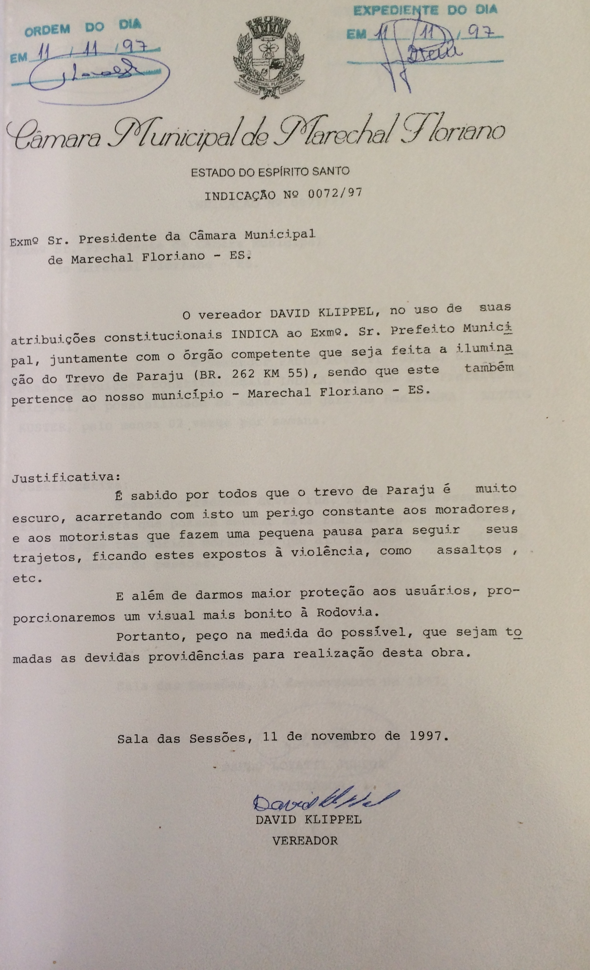 Ementa: INDICA QUE SEJA FEITA A ILUMINAÇÃO DO TREVO DE PARAJU (BR.262 KM 55), SENDO QUE ESTE TAMBÉM PERTENCE AO NOSSO MUNICÍPIO - MARECHAL FLORIANO -ES.