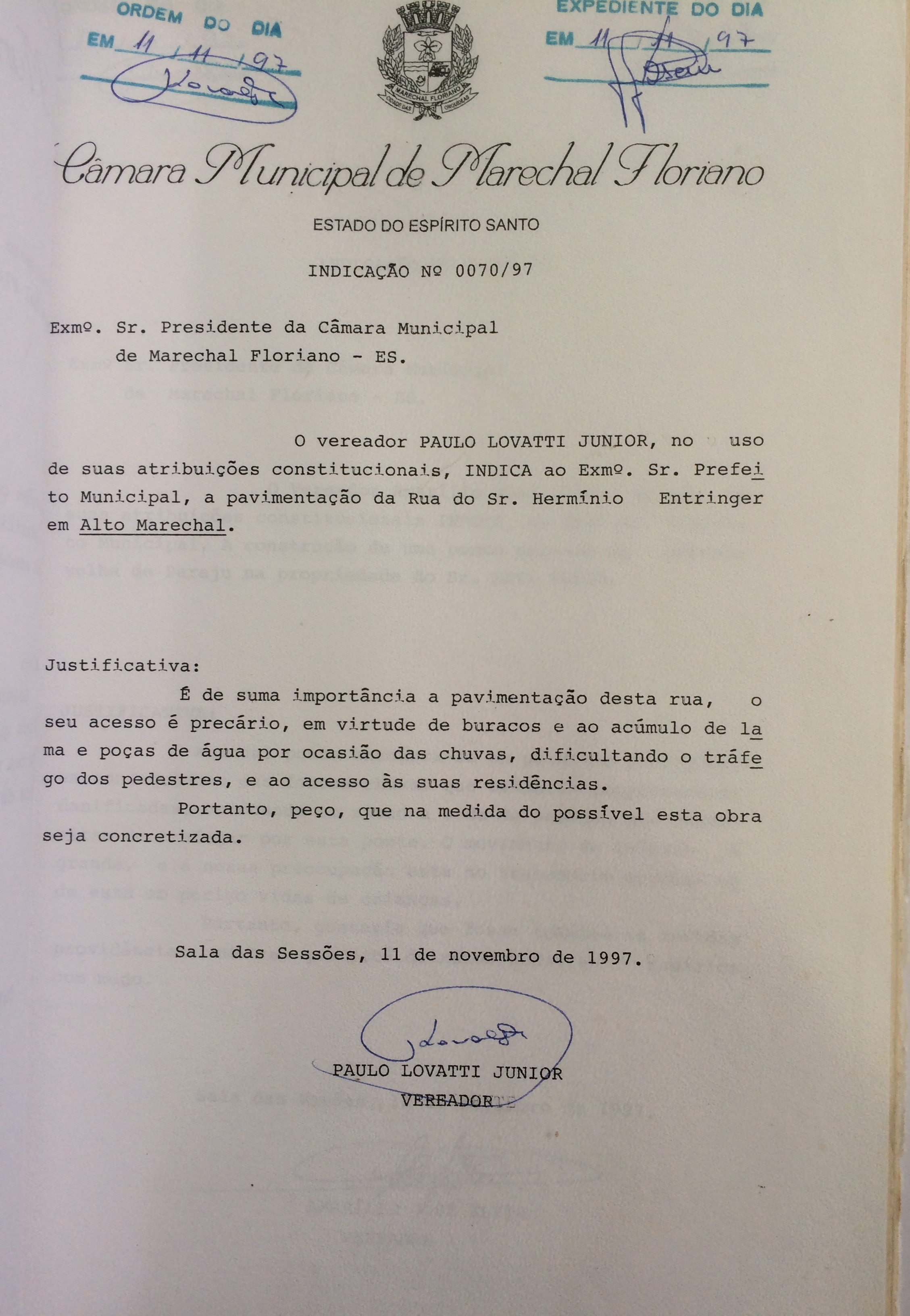 Ementa: INDICA A PAVIMENTAÇÃO DA RUA DO SR. HERMINIO ENTRINGER EM ALTO MARECHAL.