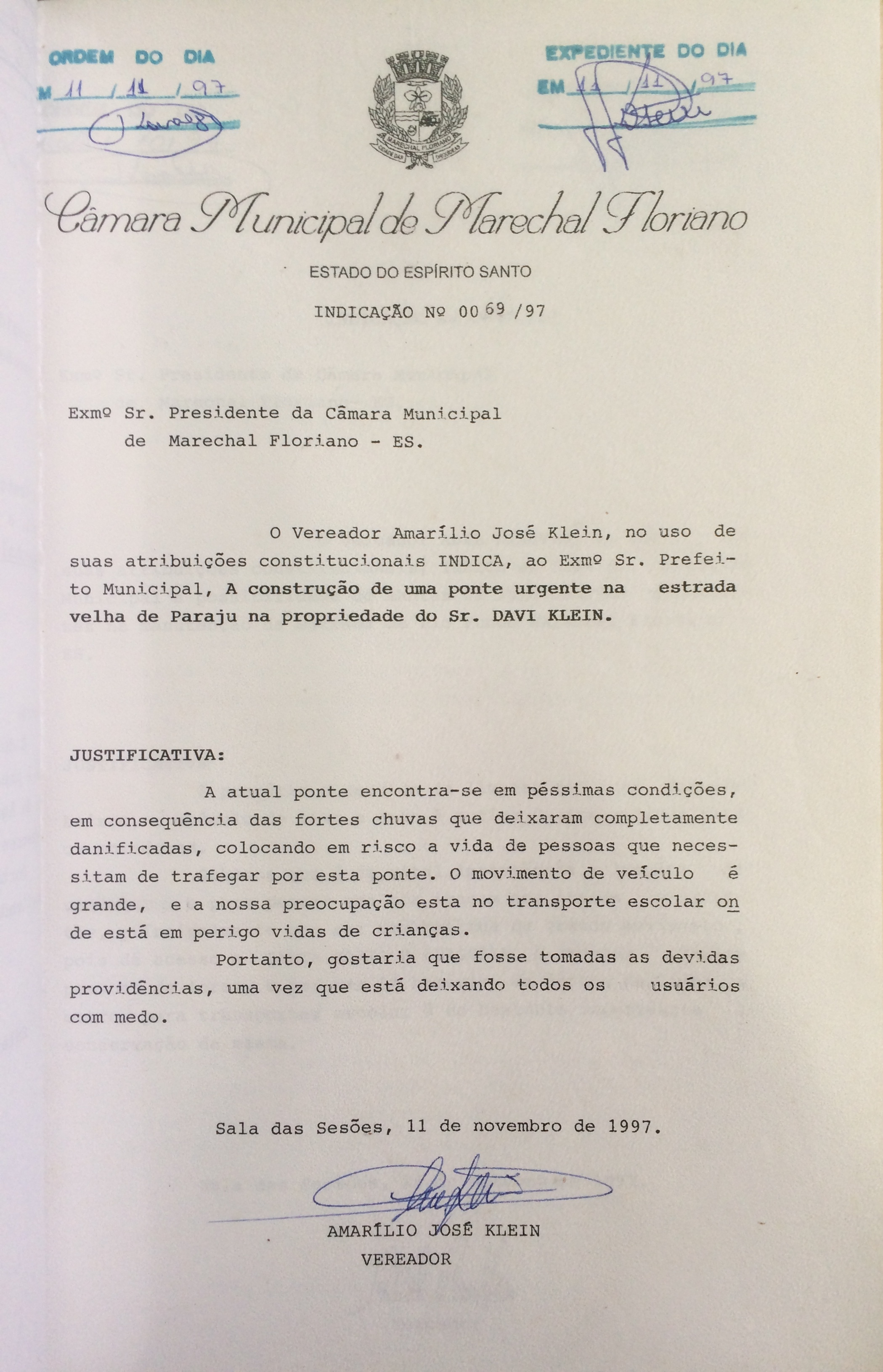 Ementa: INDICA A CONSTRUÇÃO DE UMA PONTE URGENTE NA ESTRADA VELHA DE PARAJU NA PROPRIEDADE DO SR. DAVI KLEIN.
