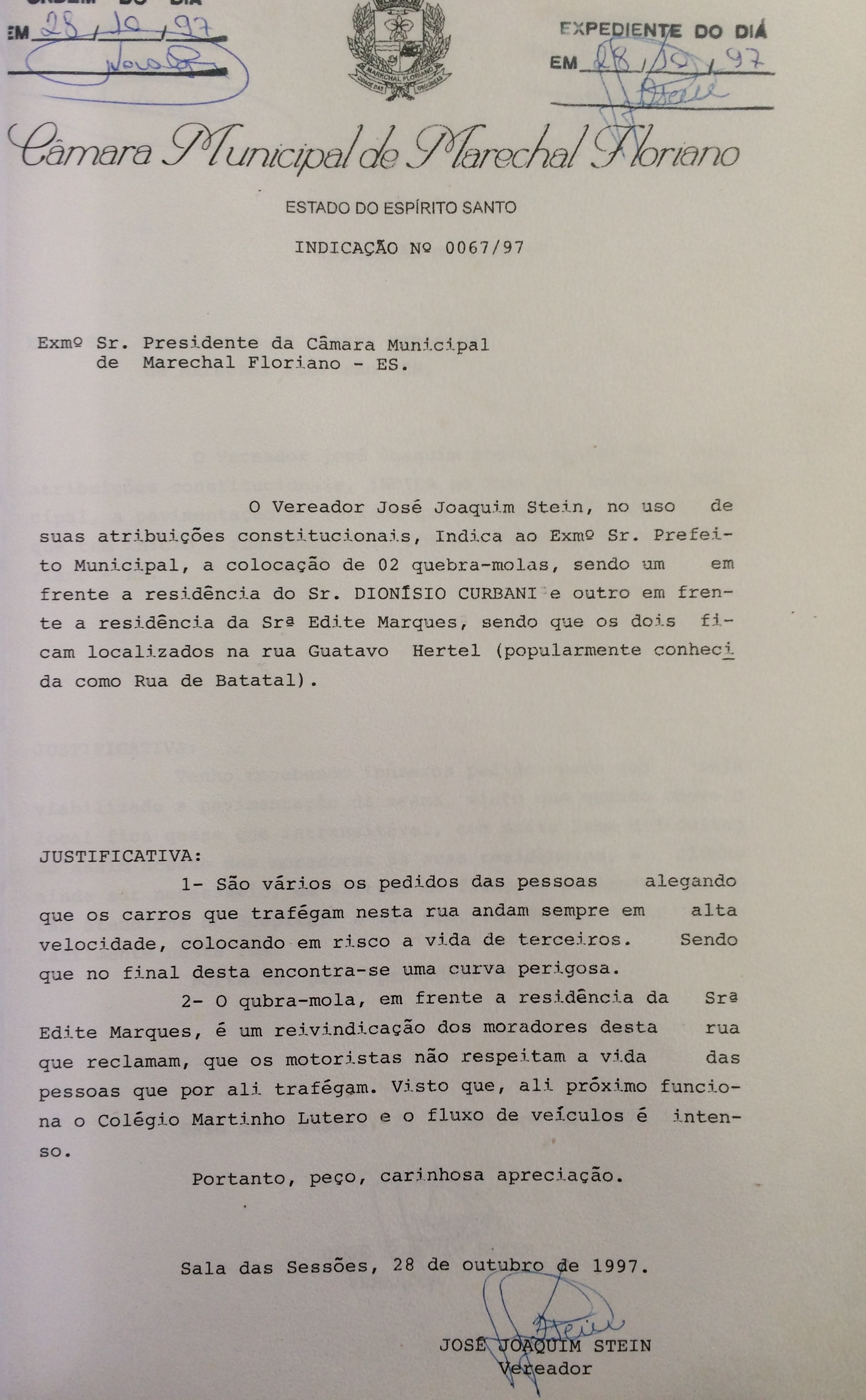 Ementa: INDICA A COLOCAÇÃO DE 02 QUEBRA-MOLAS, SENDO UM EM FRENTE A RESIDÊNCIA DO SR. DIONÍSIO CURBANI E OUTRO EM FRENTE A RESIDÊNCIA DA SRª EDITE MARQUES, SENDO QUE OS DOIS FICAM LOCALIZADOS NA RUA GUSTAVO HERTEL (POPULARMENTE CONHECIDA COMO RUA DE BATATAL).