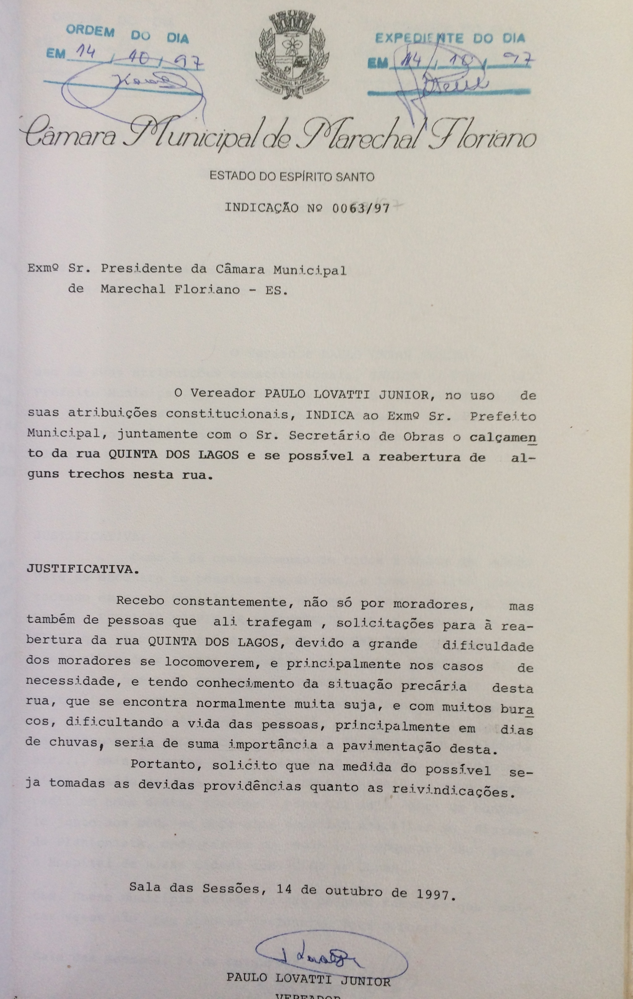 Ementa: INDICA CALÇAMENTO DA RUA QUINTA DOS LAGOS E SE POSSÍVEL A REABERTURA DE ALGUNS TRECHOS NESTA RUA.