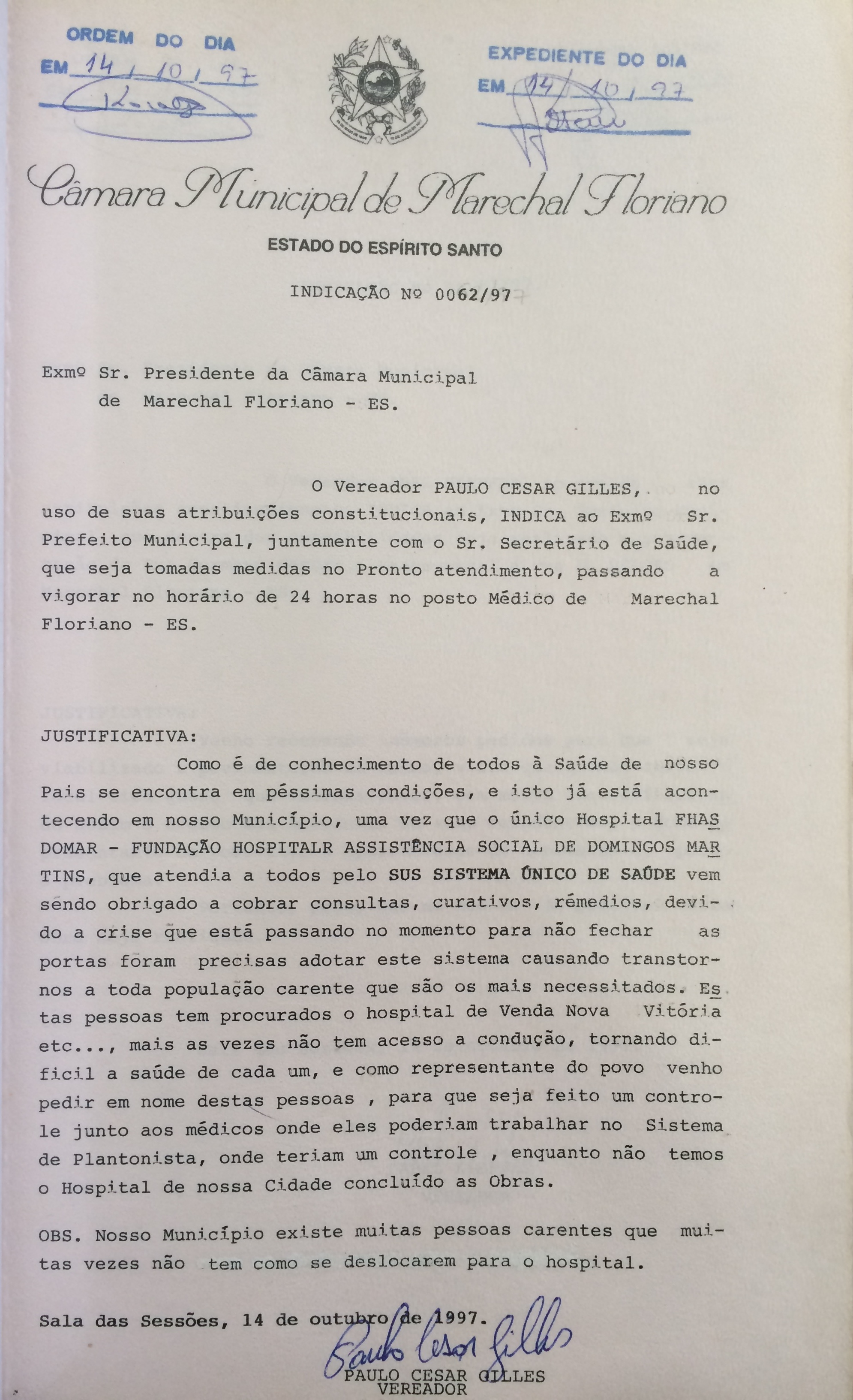 Ementa: INDICA QUE SEJA TOMADAS MEDIDAS NO PRONTO ATENDIMENTO, PASSANDO A VIGORAR NO HORÁRIO DE 24 HORAS NO POSTO MÉDICO DE MARECHAL FLORIANO-ES.