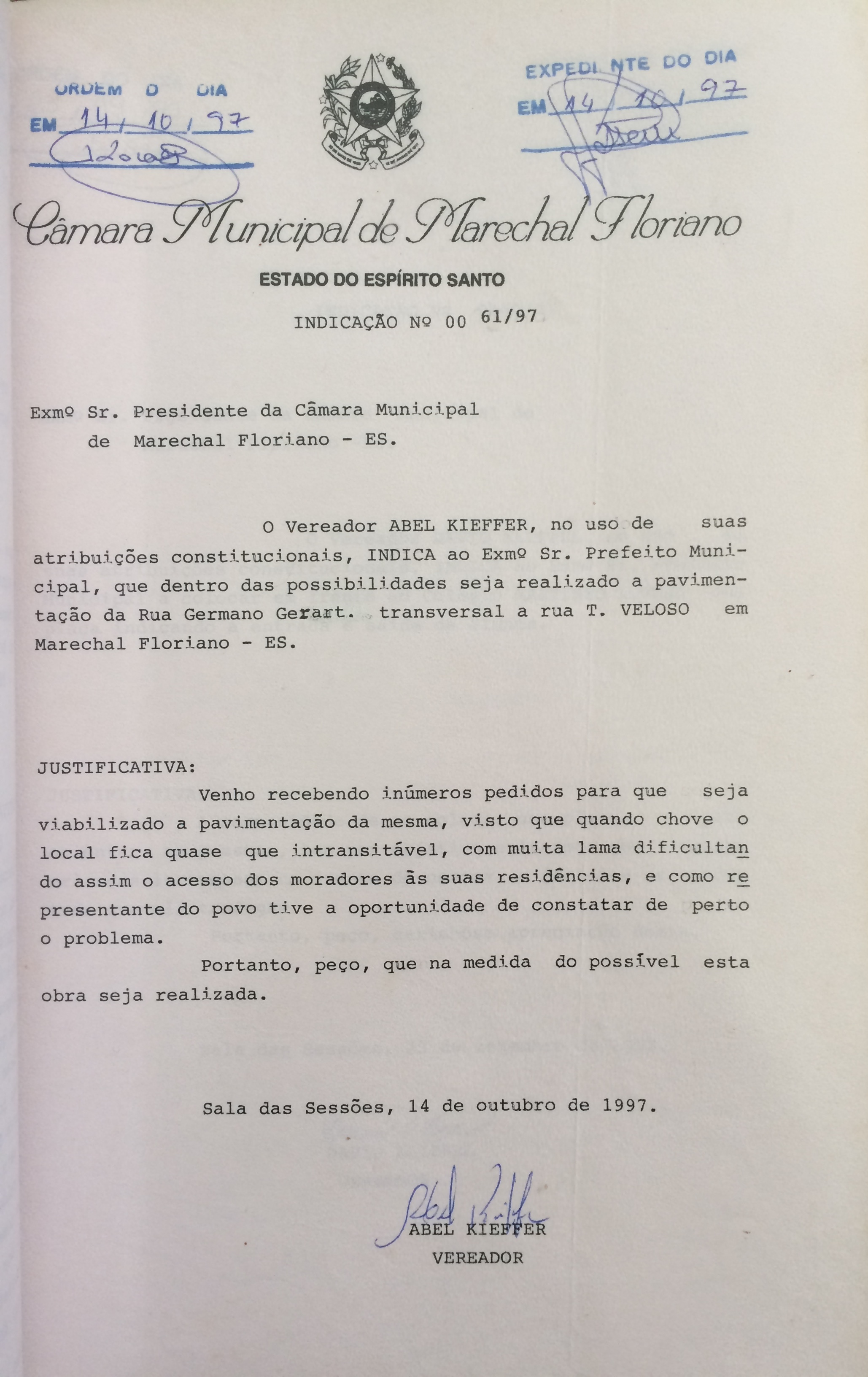 Ementa: INDICA QUE DENTRO DAS POSSIBILIDADES SEJA REALIZADO A PAVIMENTAÇÃO DA RUA GERMANO GERART, TRANSVERSAL A RUA T. VELOSO EM MARECHAL FLORIANO-ES.