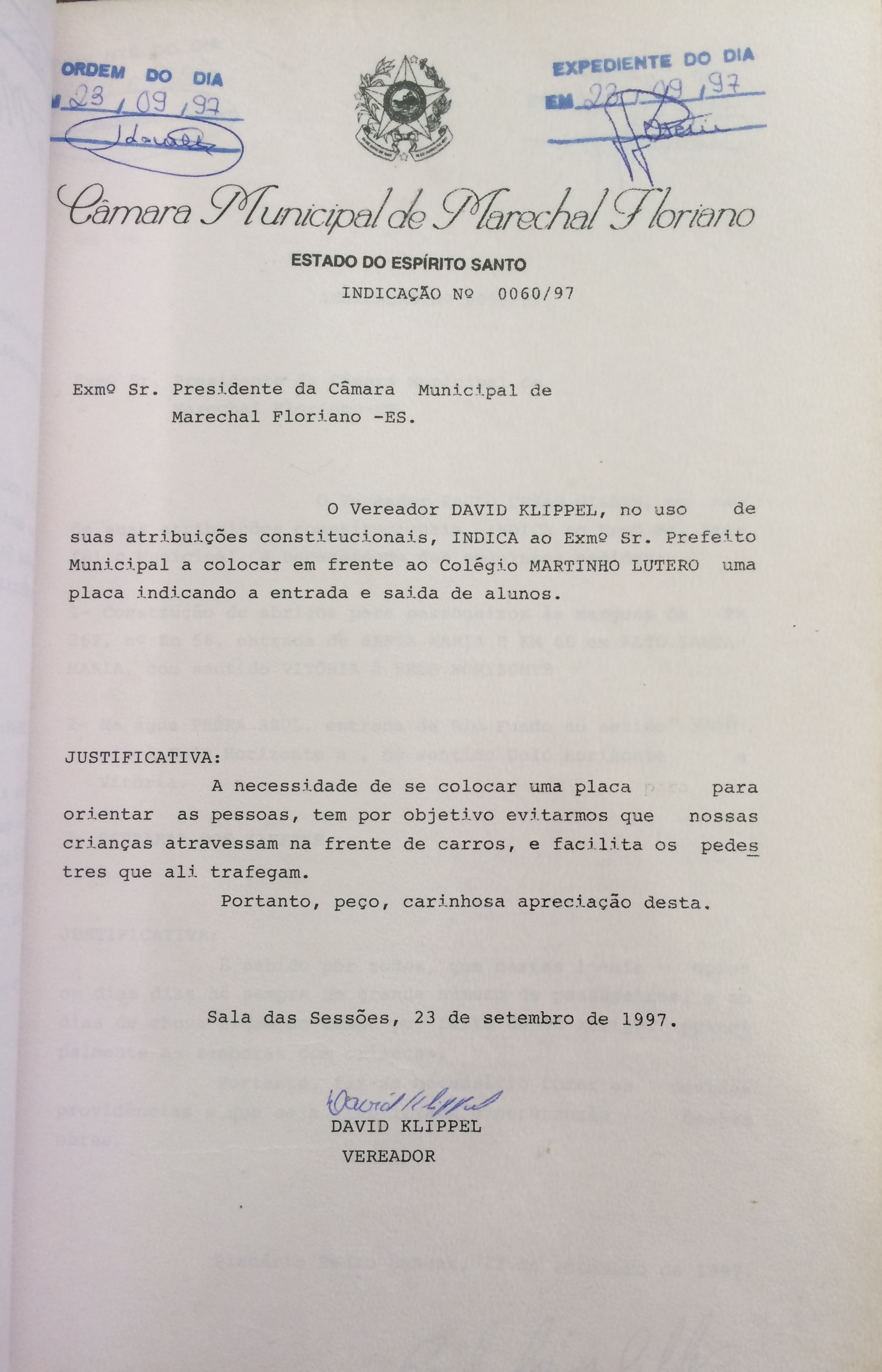 Ementa: INDICA COLOCAR EM FRENTE AO COLÉGIO MARTINHO LUTERO UMA PLACA INDICANDO A ENTRADA E SAÍDA DE ALUNOS.