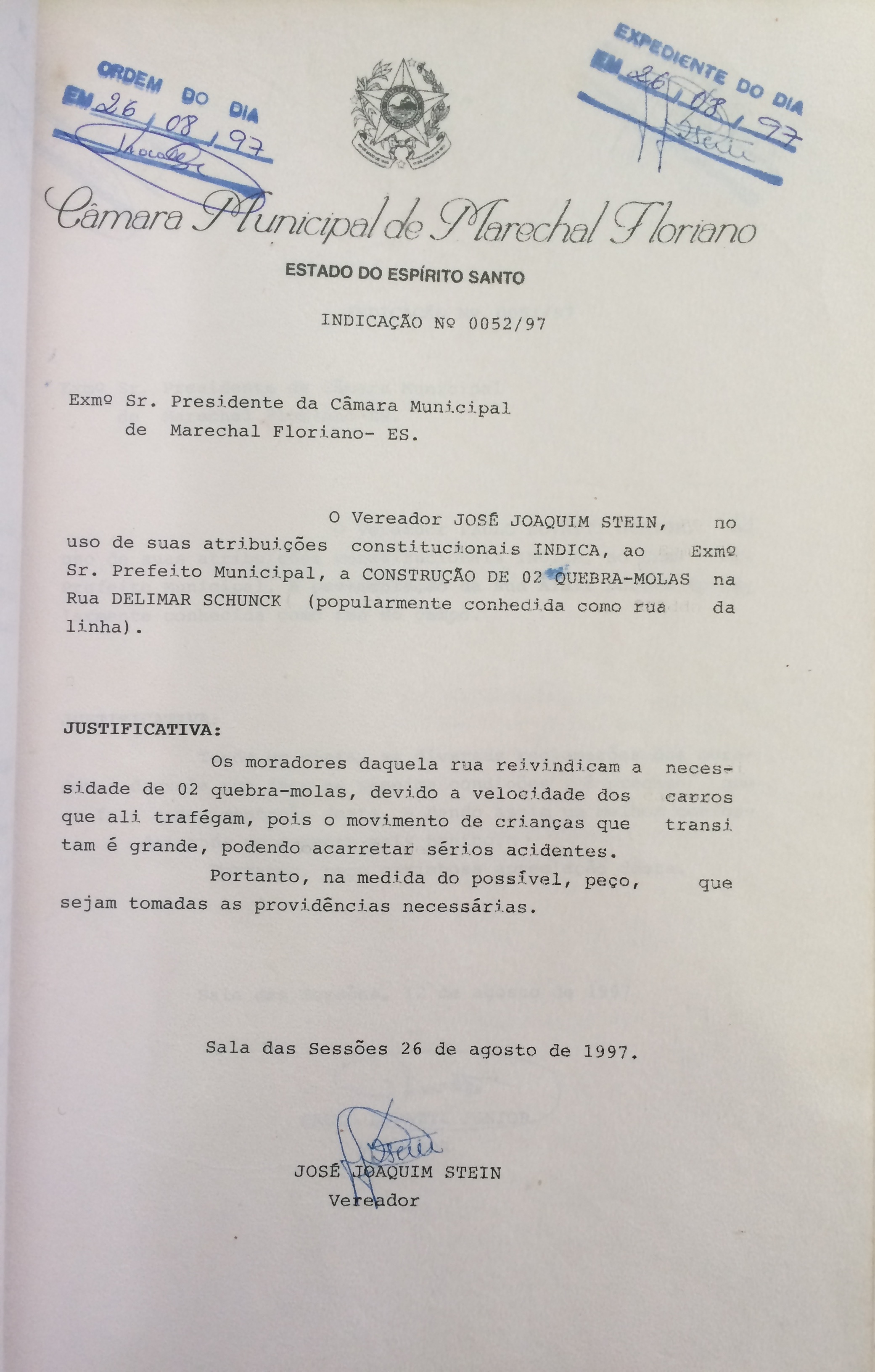 Ementa: INDICA A CONSTRUÇÃO 02 QUEBRA MOLAS NA RUA DELIMAR SCHUNK (POPULARMENTE CONHECIDA COMO RUA DA LINHA).