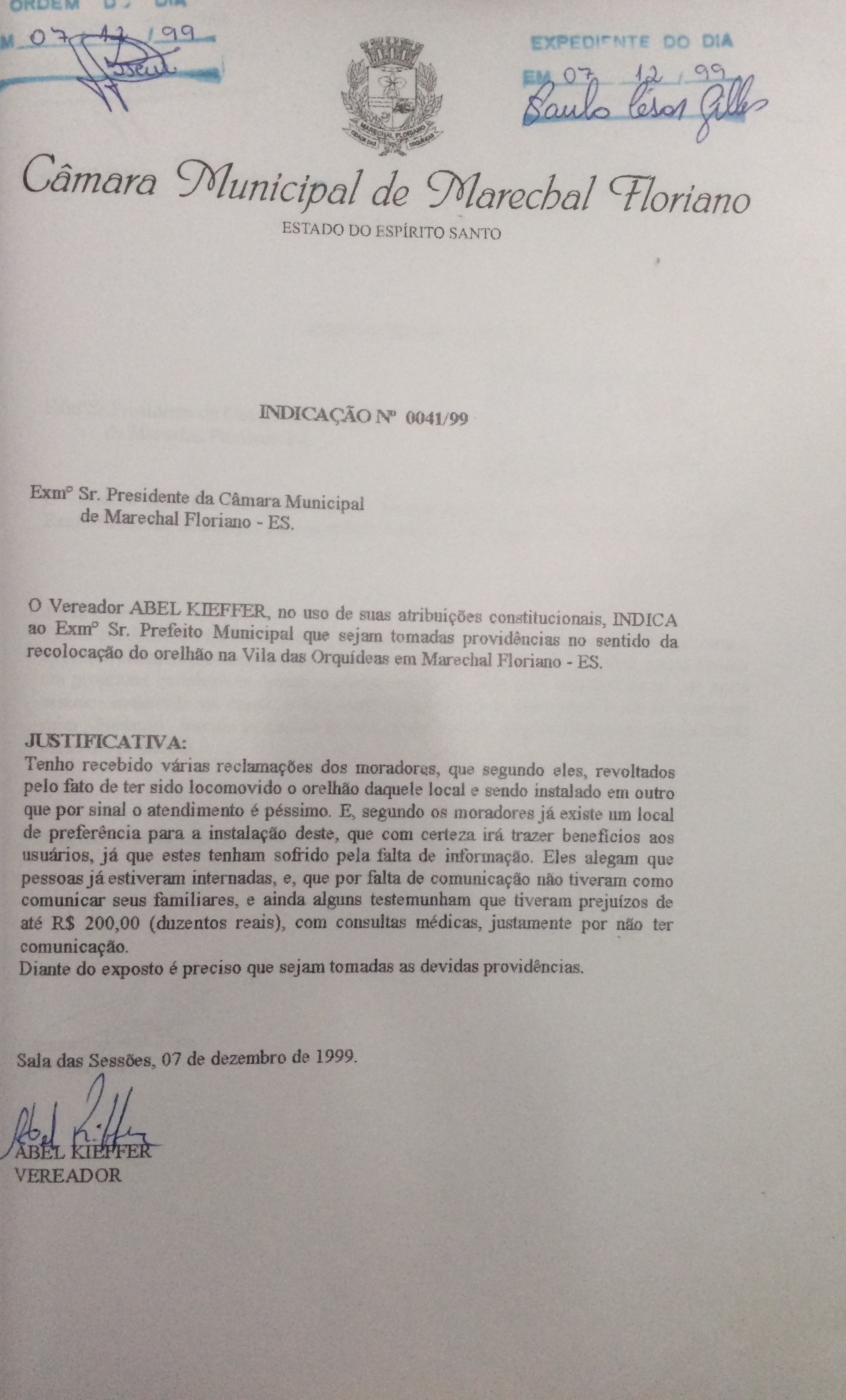 Ementa: INDICA QUE SEJAM TOMADAS PROVIDÊNCIAS NO SENTIDO DA RECOLOCAÇÃO DO ORELHÃO NA VILA DAS ORQUÍDEAS EM MARECHAL FLORIANO-ES.