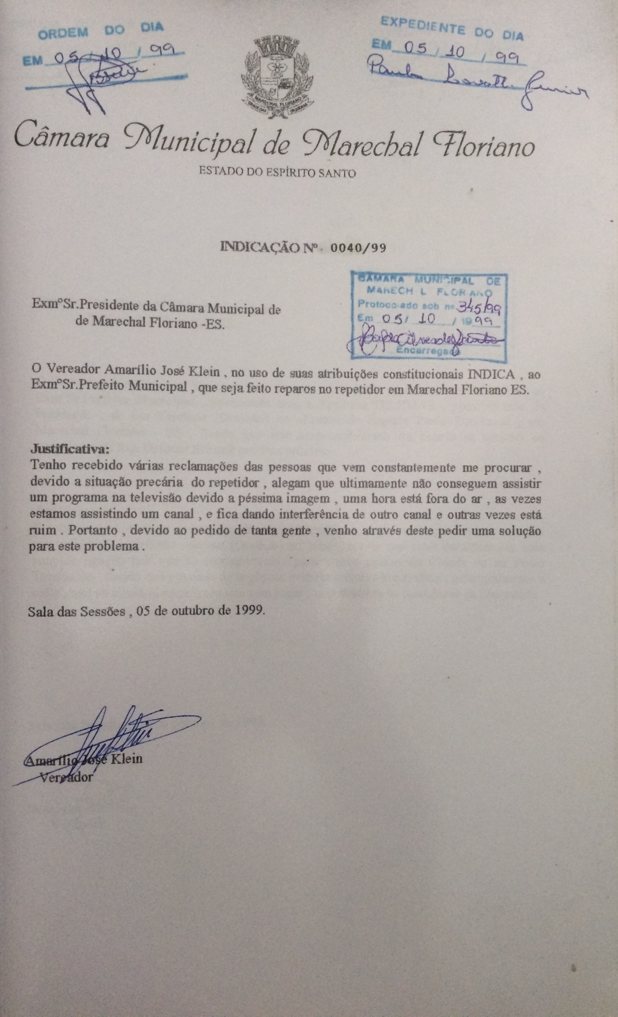 Ementa: INDICA QUE SEJA FEITO REPAROS NO REPETIDOR EM MARECHAL FLORIANO ES.