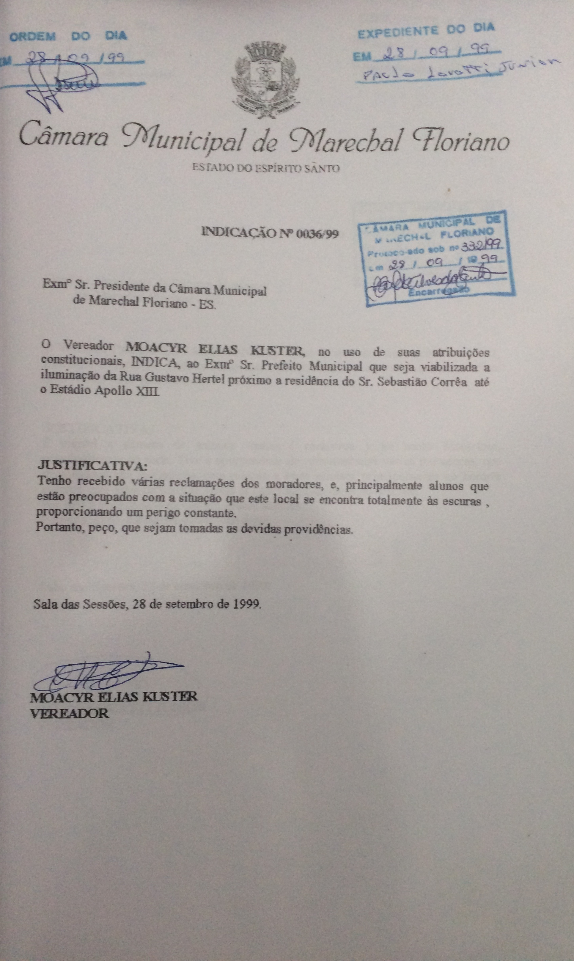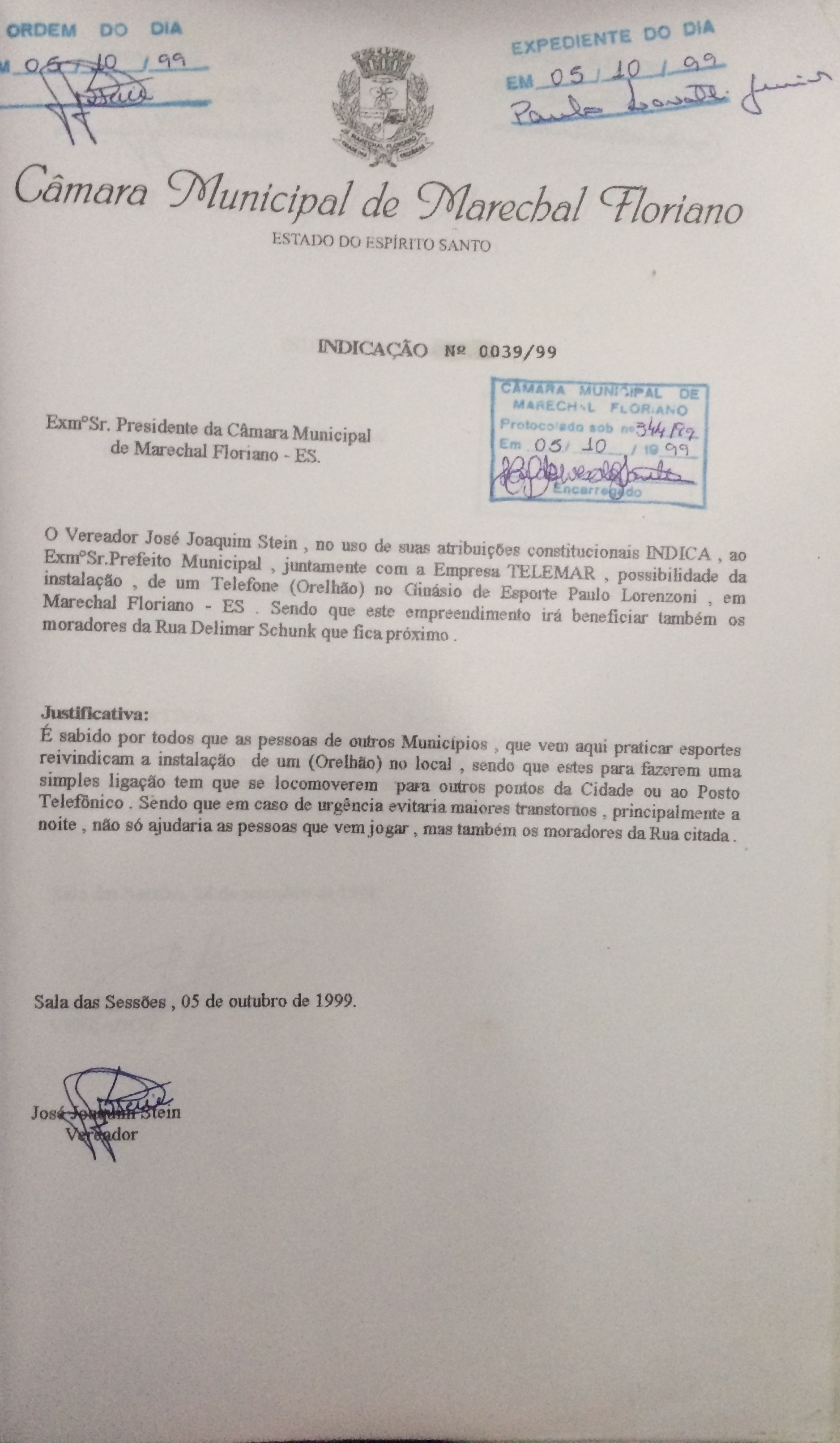 Ementa: INDICA POSSIBILIDADE DA INSTALAÇÃO DE UM TELEFONE (ORELHÃO) NO GINÁSIO DE ESPORTES PAULO LORENZONI, EM MARECHAL FLORIANO-ES. SENDO QUE ESTE EMPREENDIMENTO IRÁ BENEFICIAR TAMBÉM OS MORADORES DA RUA DELIMAR SCHUNK QUE FICA PRÓXIMO.