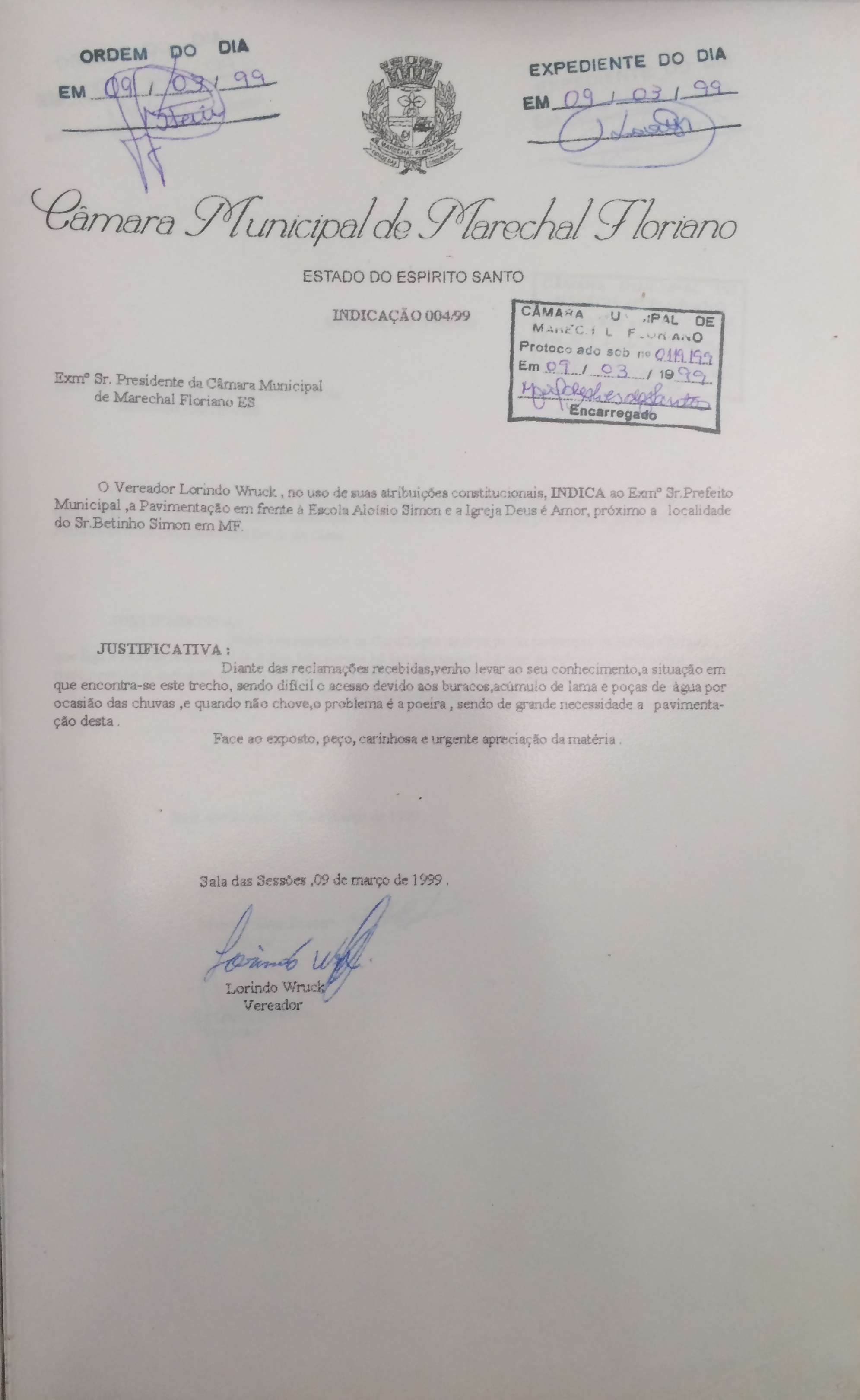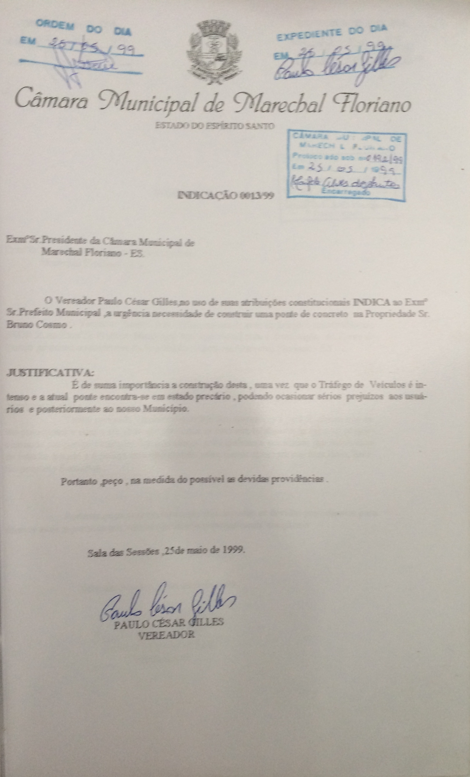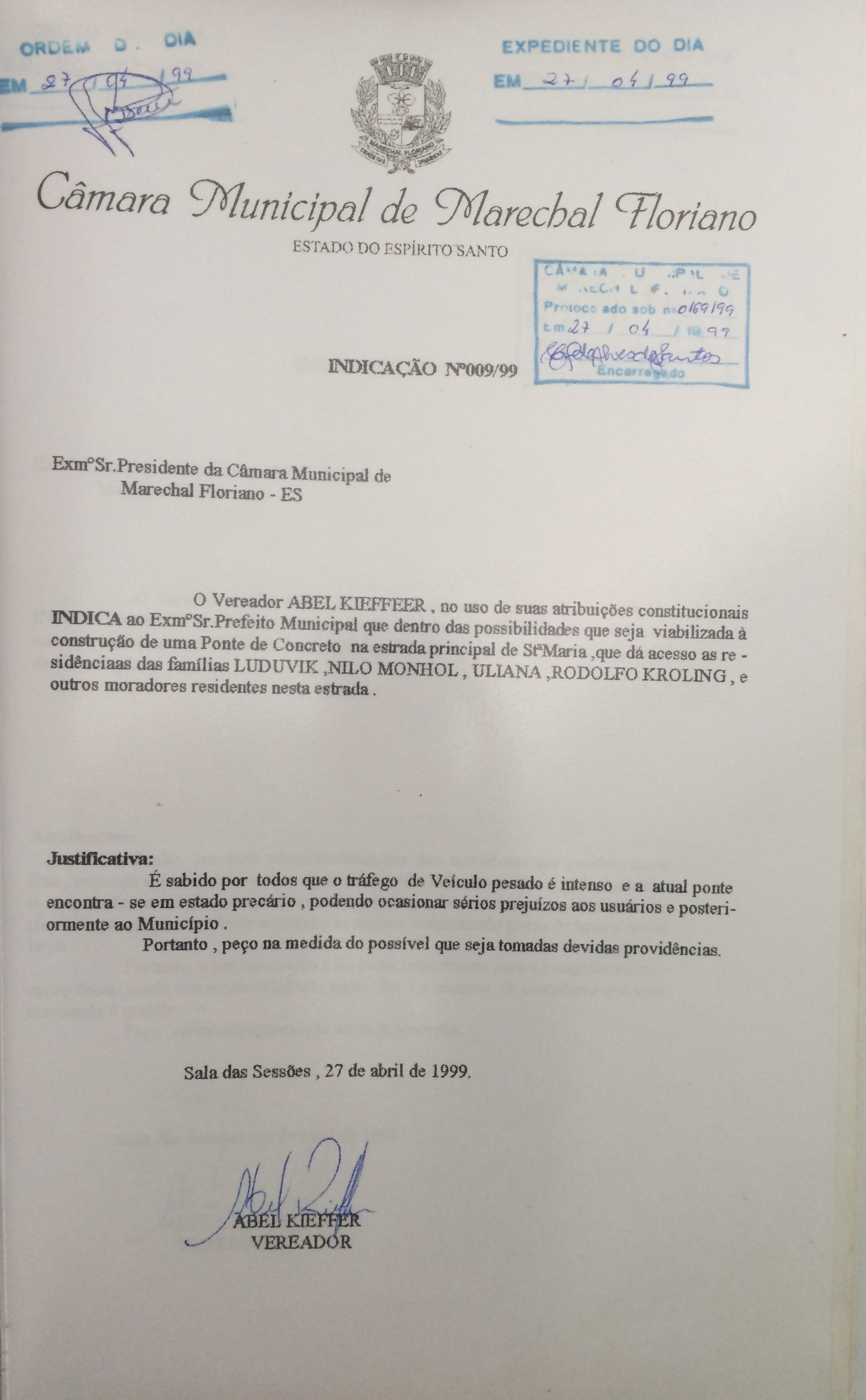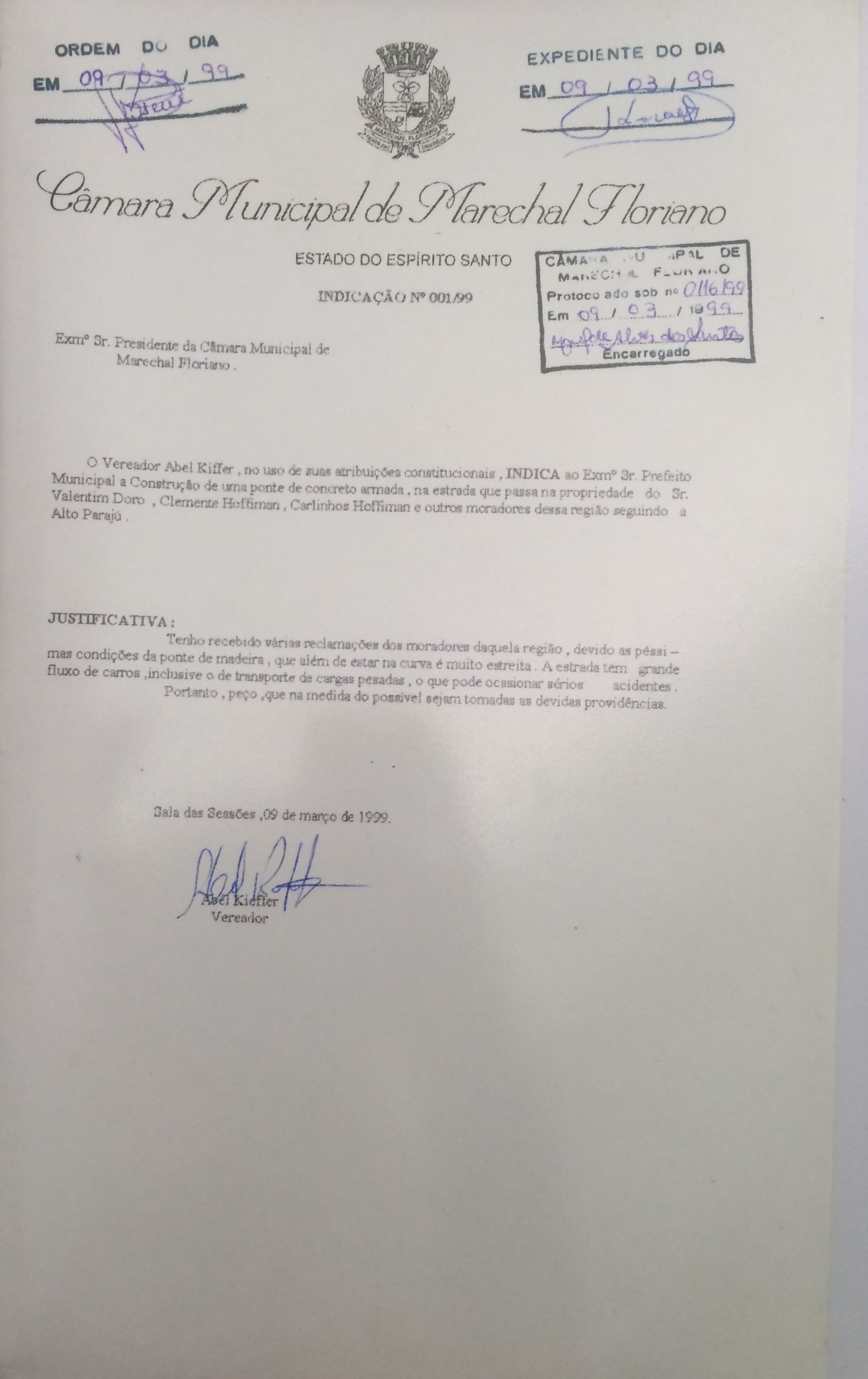 Ementa: INDICA A CONSTRUÇÃO DE UMA PONTE DE CONCRETO ARMADA NA ESTRADA QUE PASSA NA PROPRIEDADE DO SR. VALENTIM DORO, CLEMENTE HOFFMAN, CARLINHOS HOFFMAN E OUTROS MORADORES DESSA REFIÃO SEGUINDO A ALTO PARAJU.