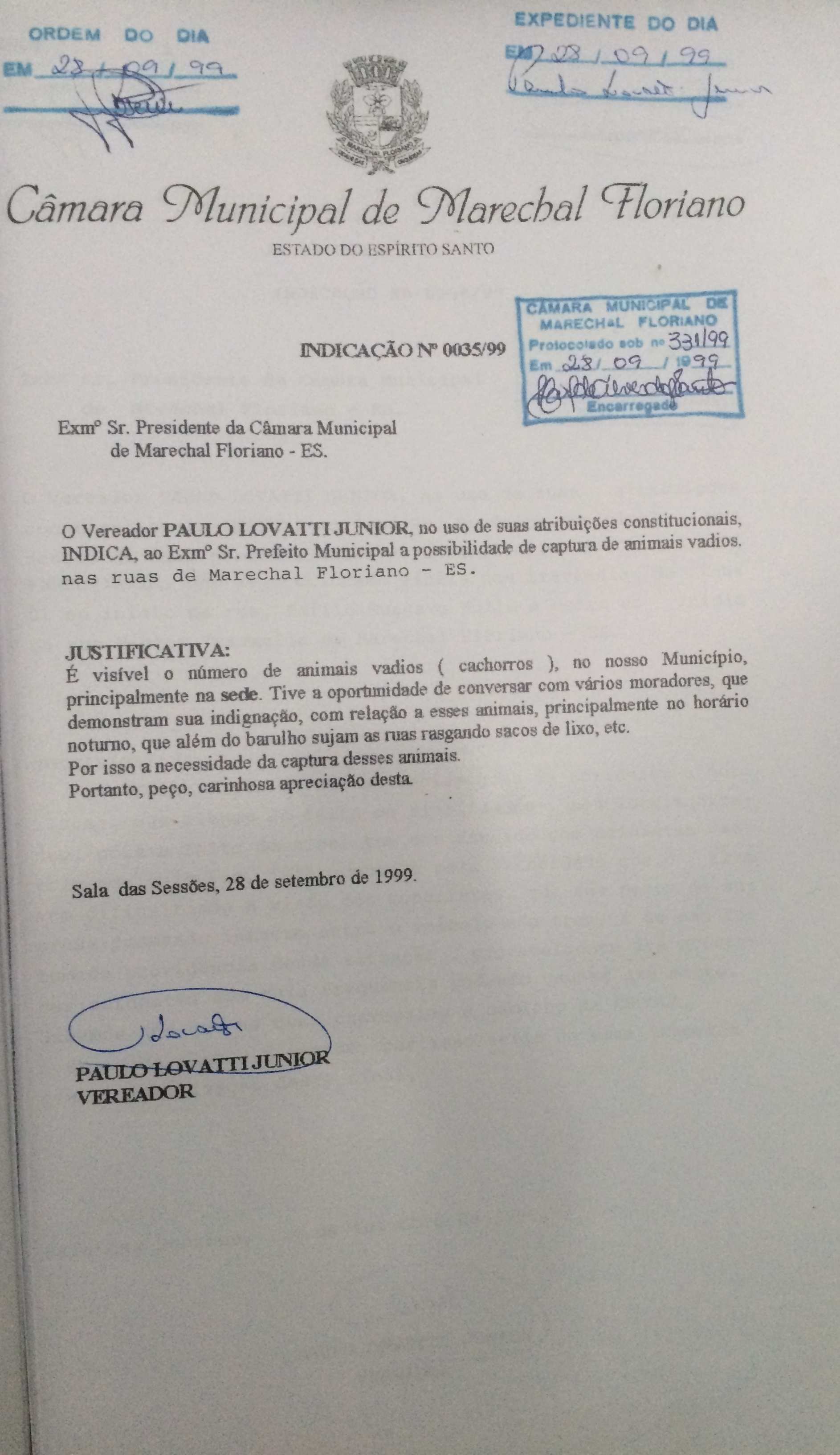 Ementa: INDICA A POSSIBILIDADE DE CAPTURA DE ANIMAIS VADIOS NAS RUAS DE MARECHAL FLORIANO-ES.