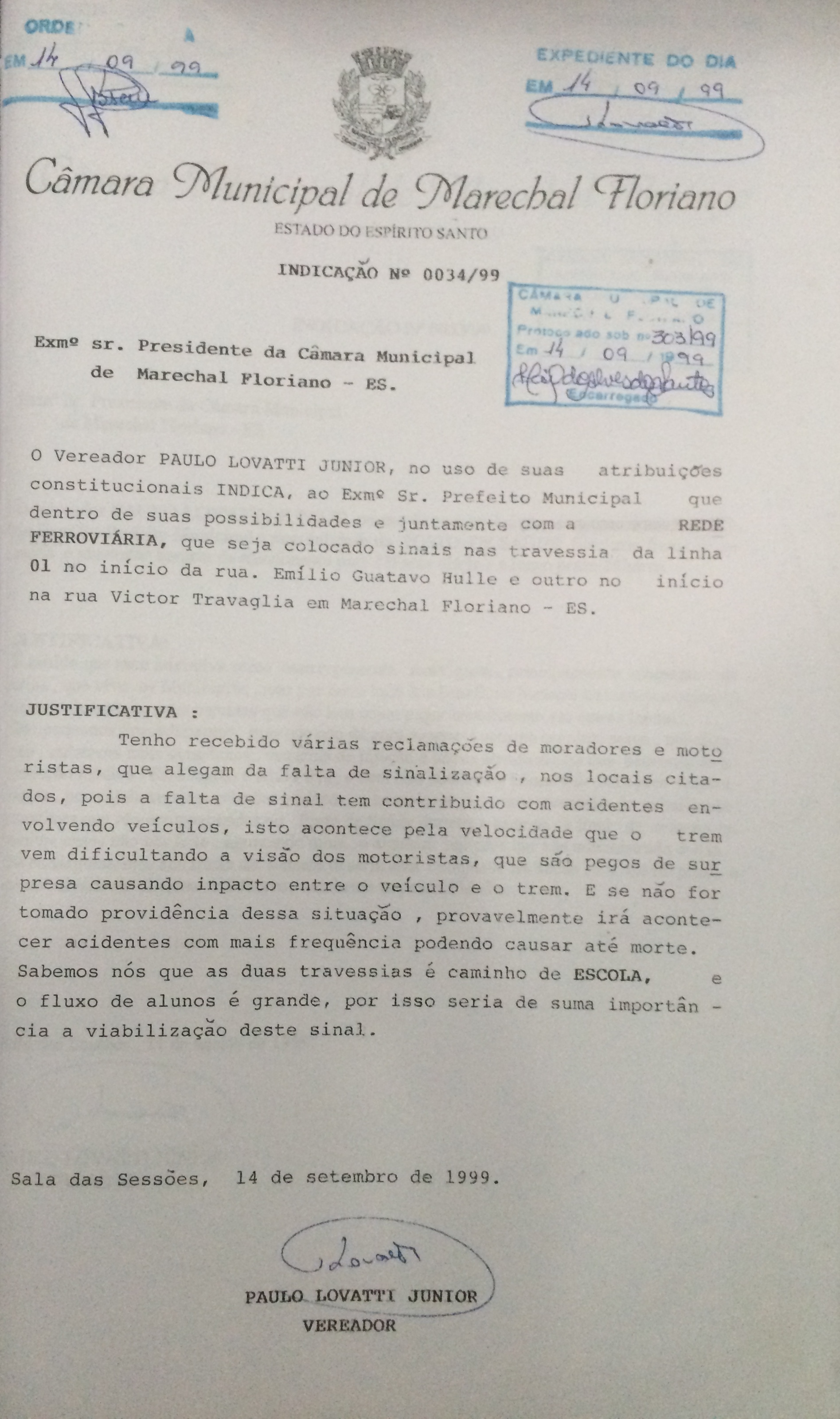 Ementa: INDICA QUE SEJA COLOCADO SINAIS NA TRAVESSIA DA LINHA 01 NO INICIO DA RUA EMÍLIO GUSTAVO HULLE E OUTRO NO INICIO NA RUA VICTOR TRAVAGLIA EM MARECHAL FLORIANO-ES.