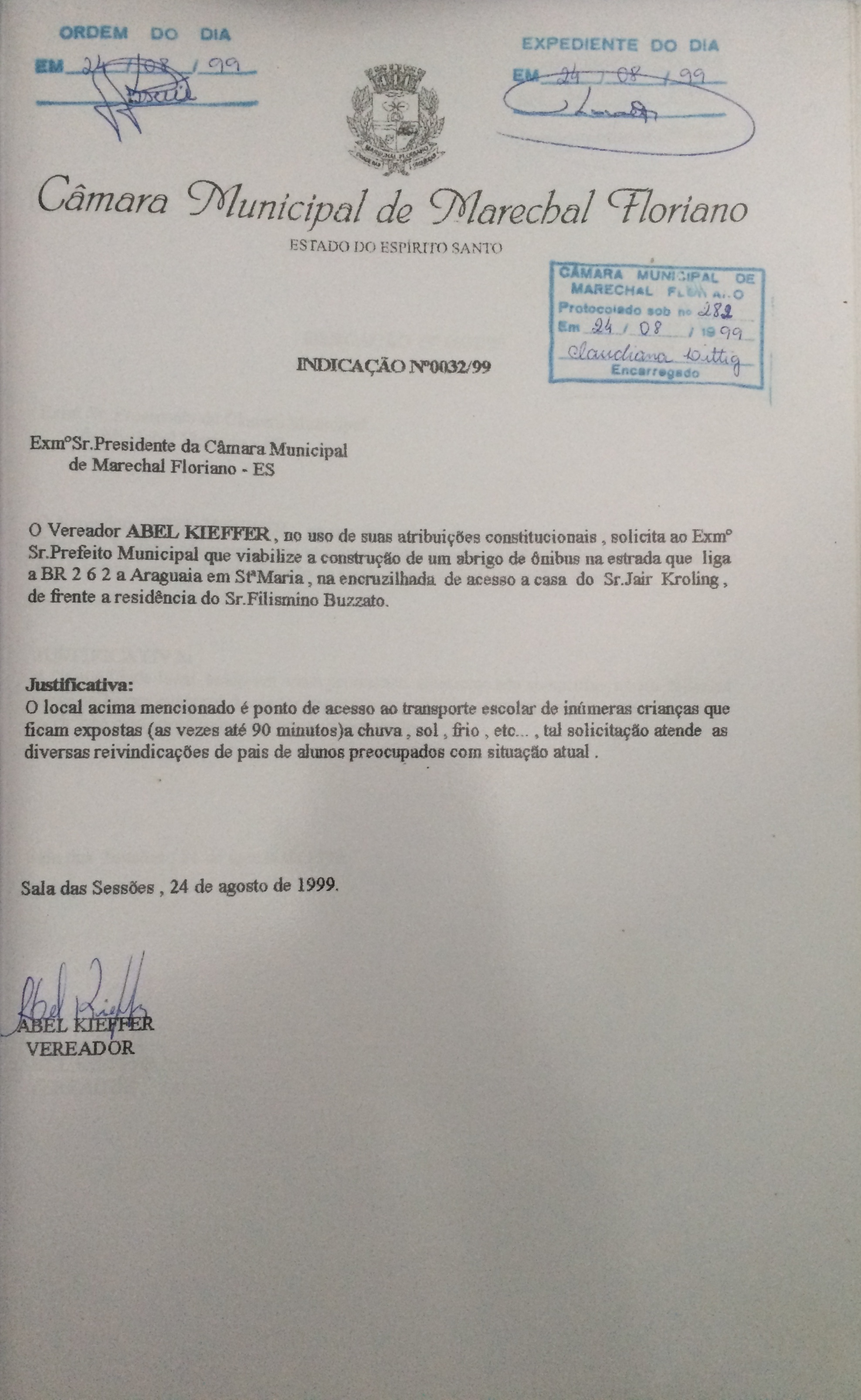 Ementa: SOLICITA QUE VIABILIZE A CONSTRUÇAO DE UM ABRIGO DE ÔNIBUS NA ESTRADA QUE LIGA A BR 262 A ARAGUAIA EM STª MARIA, NA ENCRUZILHADA DE ACESSO A CASA DO SR. JAIR KROLING, EM FRENTE A RESIDÊNCIA DO SR. FILISMINO BUZZATO.