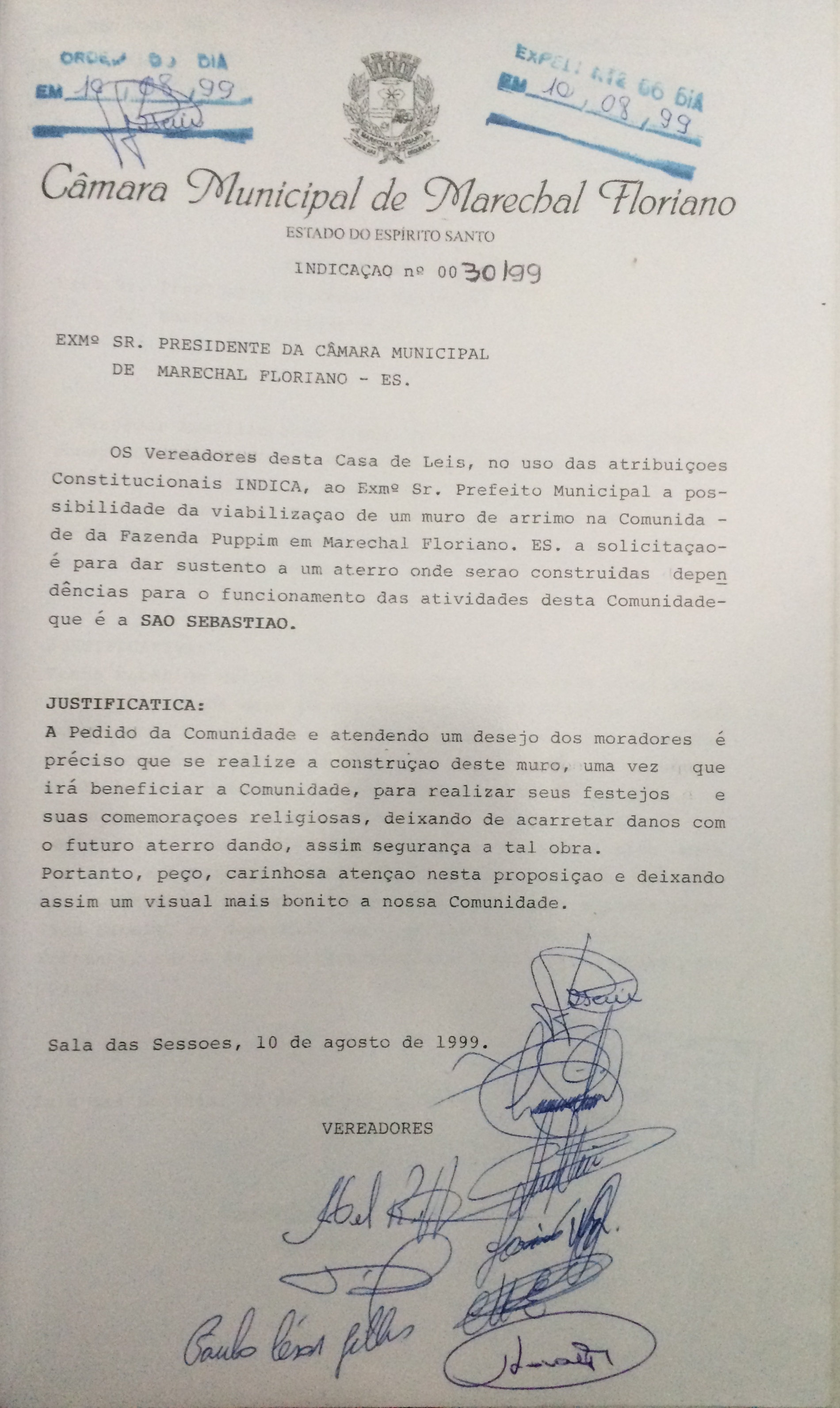 Ementa: INDICA A POSSIBILIDADE DE VIABILIZAÇÃO DE UM MURO DE ARRIMO NA COMUNIDADE DA FAZENDA PUPPIM EM MARECHAL FLORIANO-ES A SOLICITAÇÃO É PARA DAR SUSTENTO A UM ATERRO ONDE SERÃO CONSTRUÍDAS DEPENDÊNCIAS PARA O FUNCIONAMENTO DAS ATIVIDADES DESTA COMUNIDADE QUE É A SÃO SEBASTIÃO.