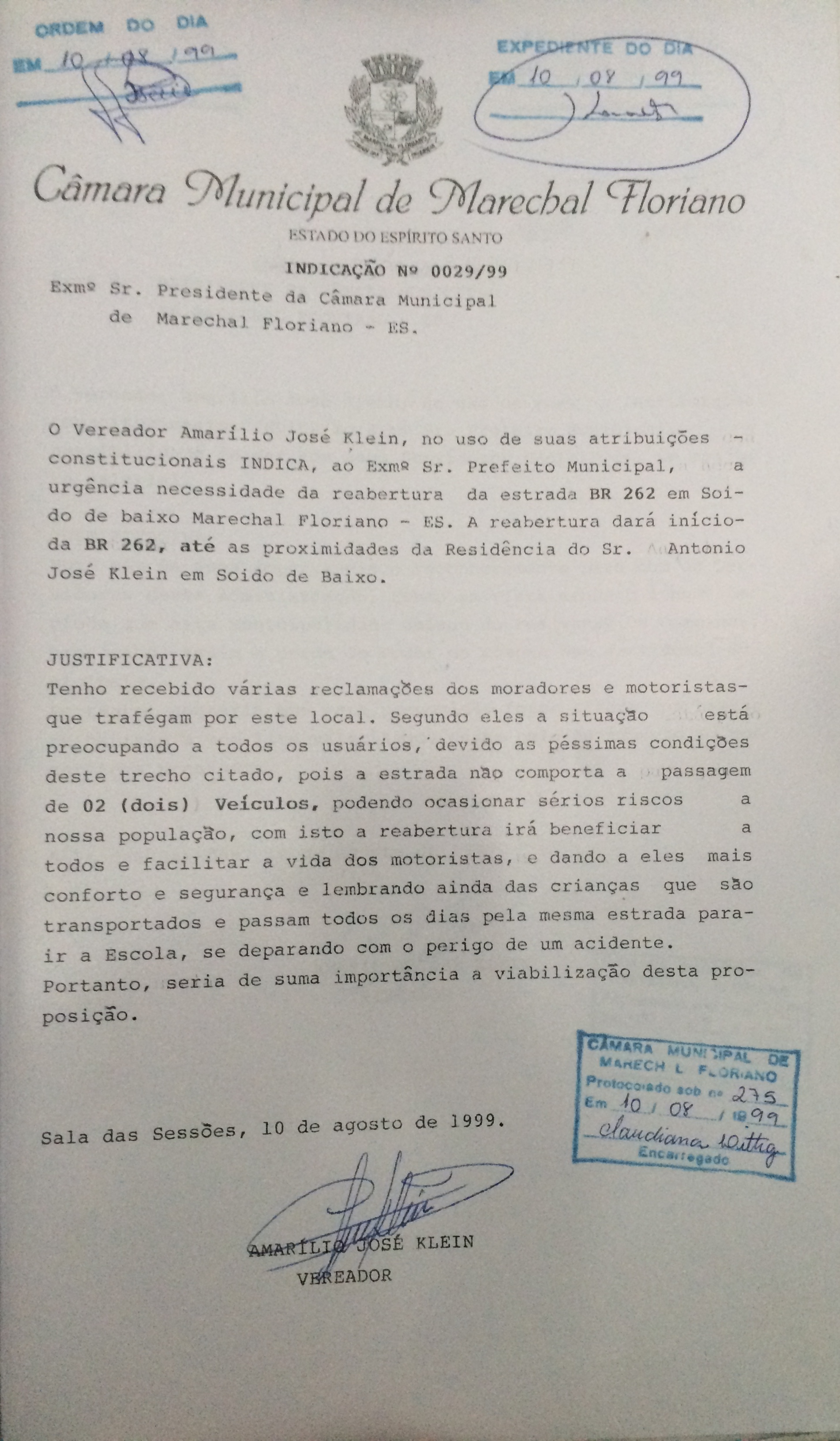 Ementa: INDICA A URGÊNCIA NECESSIDADE DA REABERTURA DA ESTRADA BR 262 EM SOÍDO DE BAIXO MARECHAL FLORIANO-ES. A REABERTURA DARÁ INICIO DA BR 262, ATÉ AS PROXIMIDADES DA RESIDÊNCIA DO SR. ANTONIO JOSÉ KLEIN EM SOÍDO DE BAIXO.
