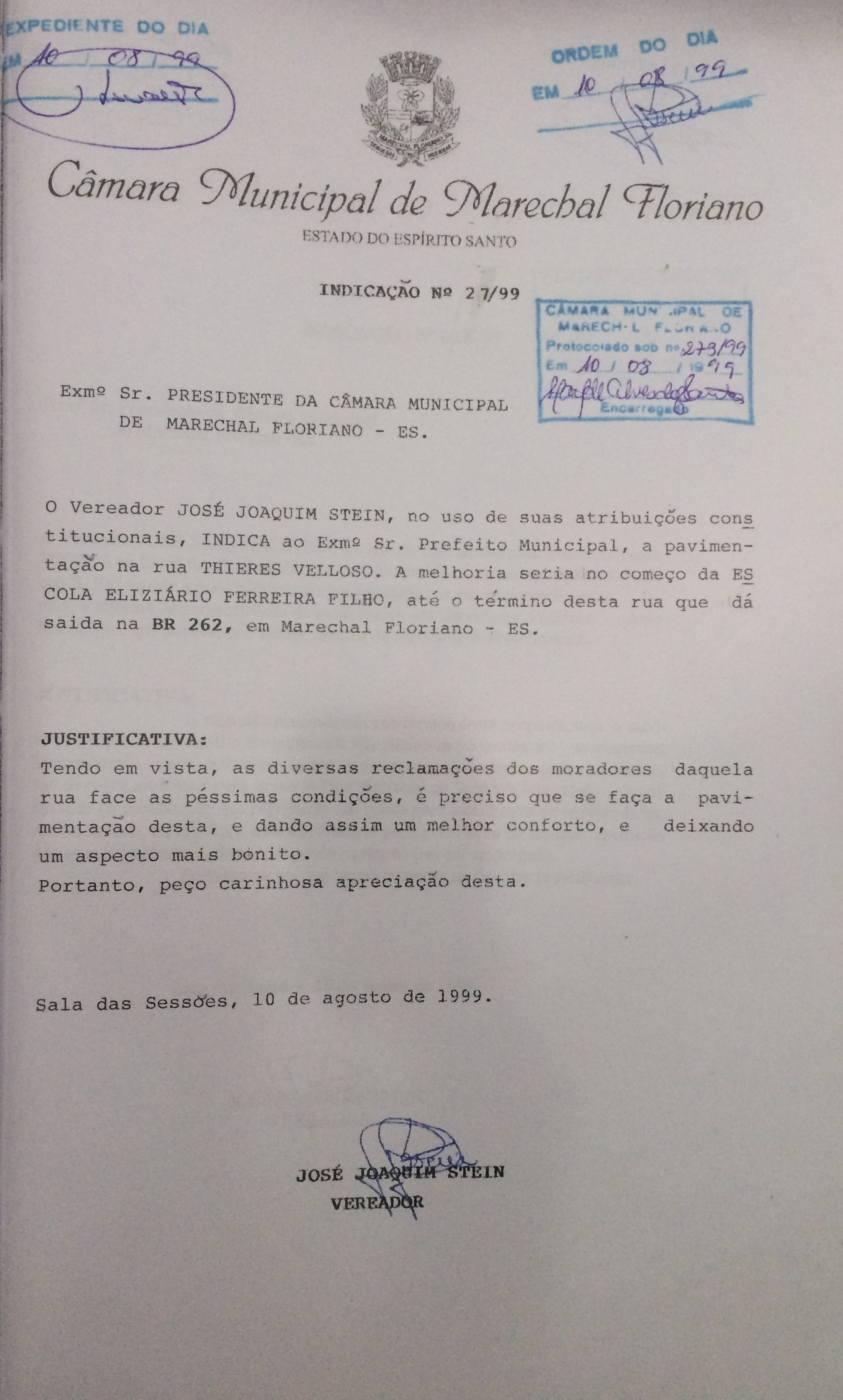 Ementa: INDICA A PAVIMENTAÇÃO NA RUA THIERES VELOSO A MELHORIA SERIA NO COMEÇO DA ESCOLA ELIZIÁRIO FERREIRA FILHO, ATÉ O TÉRMINO DESTA RUA QUE DÁ SAÍDA NA BR 262, EM MARECHAL FLORIANO-ES.