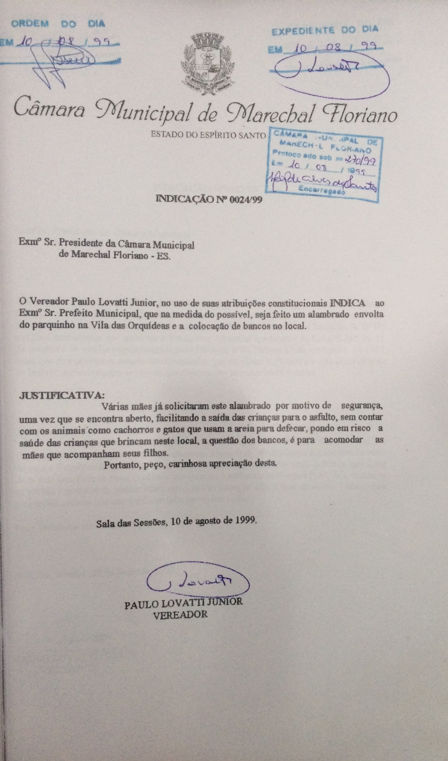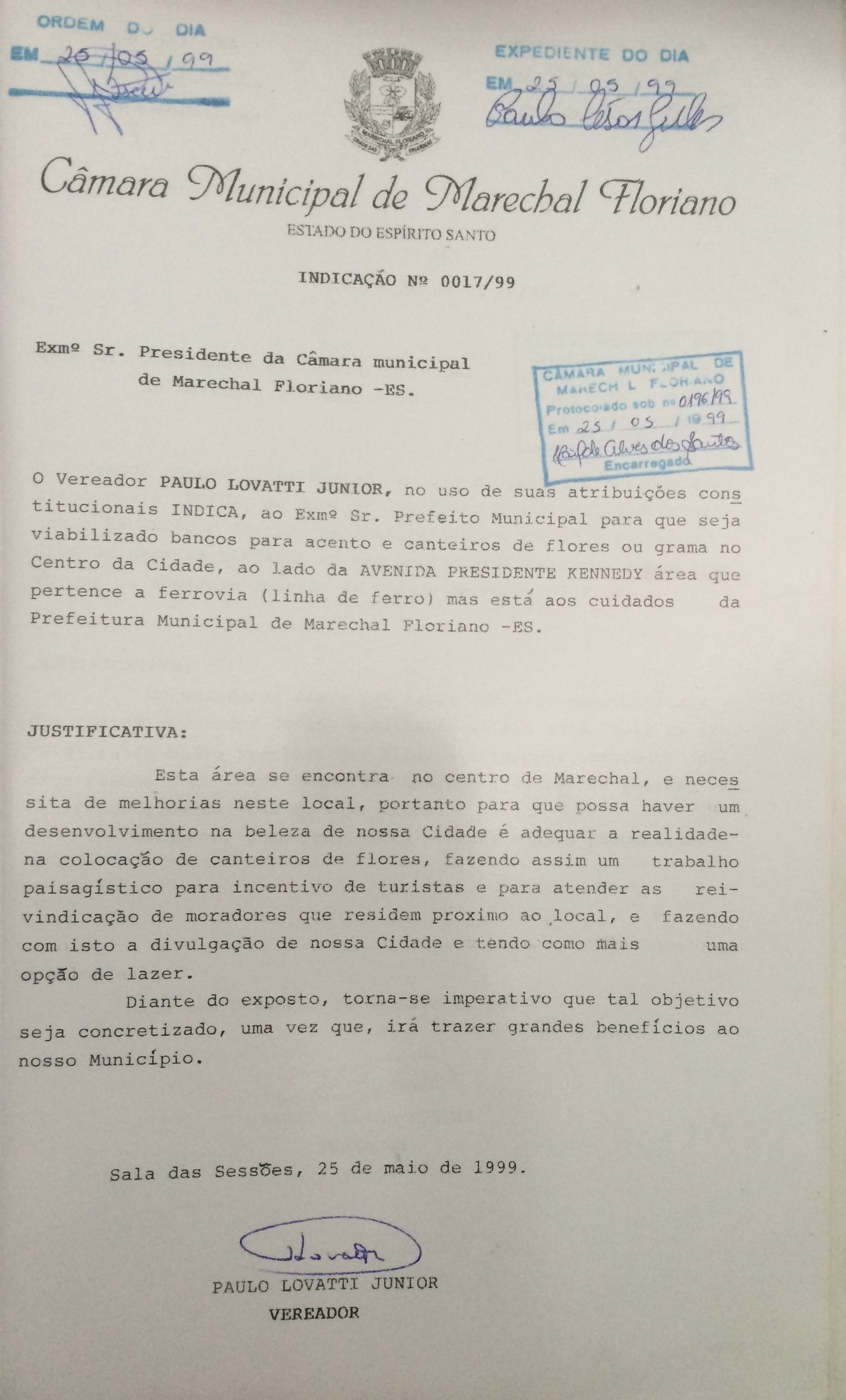 Ementa: INDICA QUE SEJA VIABILIZADO BANCOS PARA ACENTO E CANTEIROS DE FLORES OU GRAMA NO CENTRO DA CIDADE, AO LADO DA AVENIDA PRESIDENTE KENNEDY ÁREA NO PERTENCE A FERROVIA (LINHA DE FERRO) MAS ESTÁ AOS CUIDADOS DA PREFEITURA DE MARECHAL FLORIANO-ES.