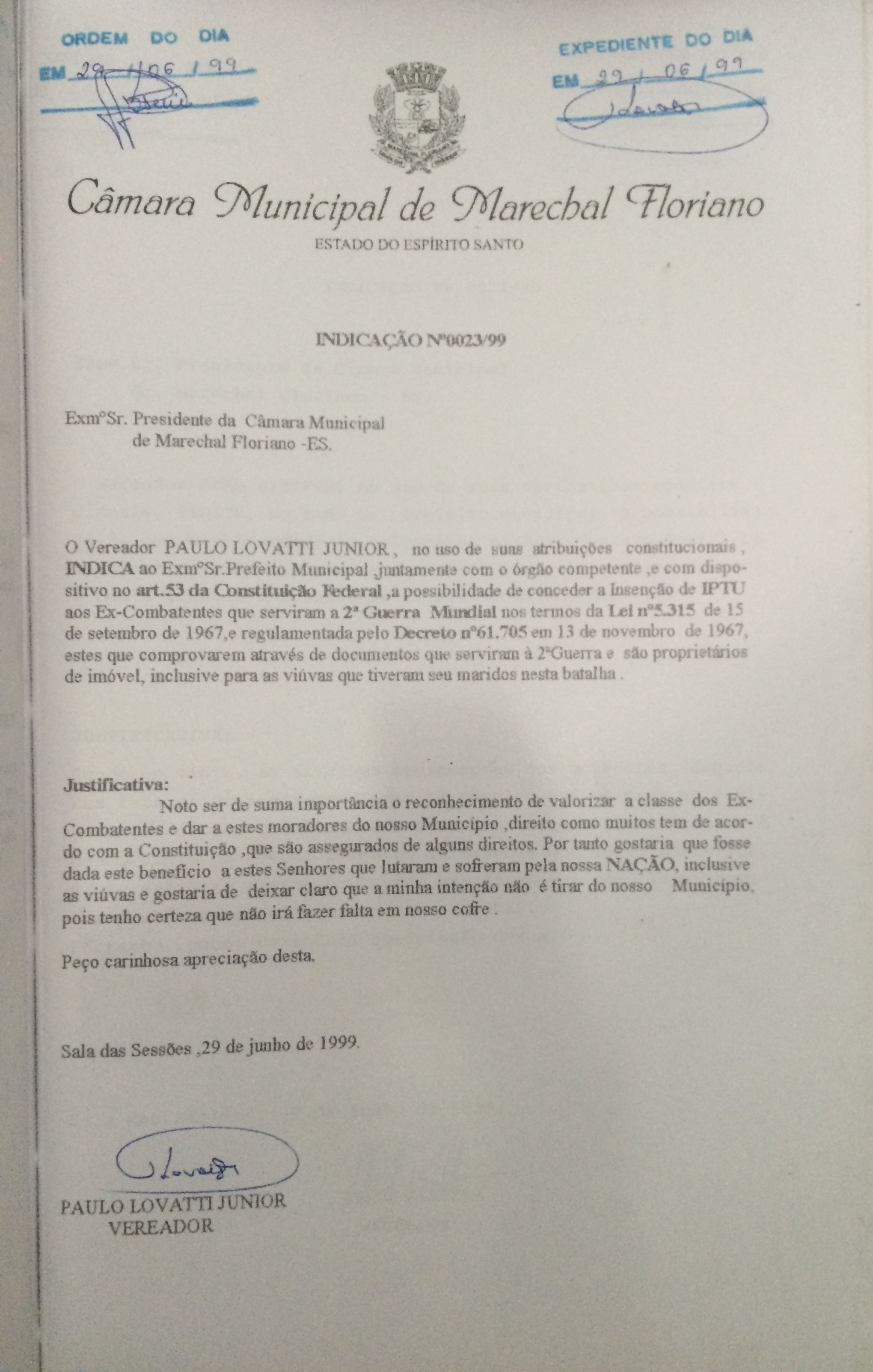 Ementa: INDICA A POSSIBILIDADE DE CONCEDER A ISENÇÃO DE IPTU AOS EX-COMBATENTES QUE SERVIRAM A 2ª GUERRA MUNDIAL NOS TERMOS DA LEI N°5.315 DE 15 DE SETEMBRO DE 1967, E REGULAMENTADA PELO DECRETO N°61.705 EM 13 DE NOVEMBRO DE 1967, ESTES QUE COMPROVAREM ATRAVÉS DE DOCUMENTOS QUE SERVIRAM À 2ª GUERRA E SÃO PROPRIETÁRIOS DE IMÓVEL, INCLUSIVE PARA VIÚVAS QUE TIVERAM SEU MARIDO NESTA BATALHA.