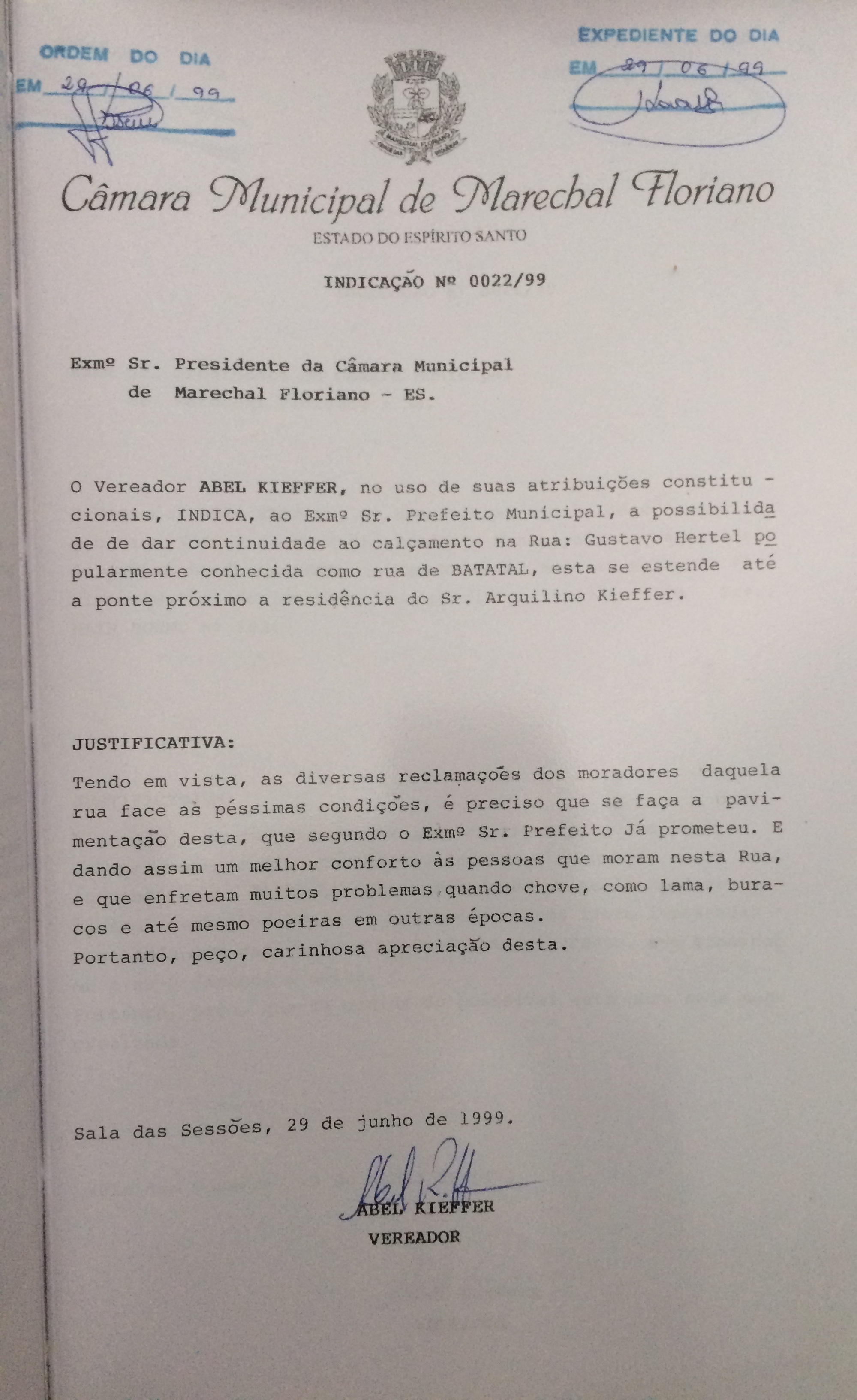 Ementa: INDICA A POSSIBILIDADE DE DAR CONTINUIDADE AO CALÇAMENTO NA RUA: GUSTAVO HERTEL POPULARMENTE CONHECIDA COMO RUA DE BATATAL, ESTA SE ESTENDE ATÉ A PONTE PRÓXIMO A RESIDÊNCIA DO SR. ARQUILINO KIEFFER.
