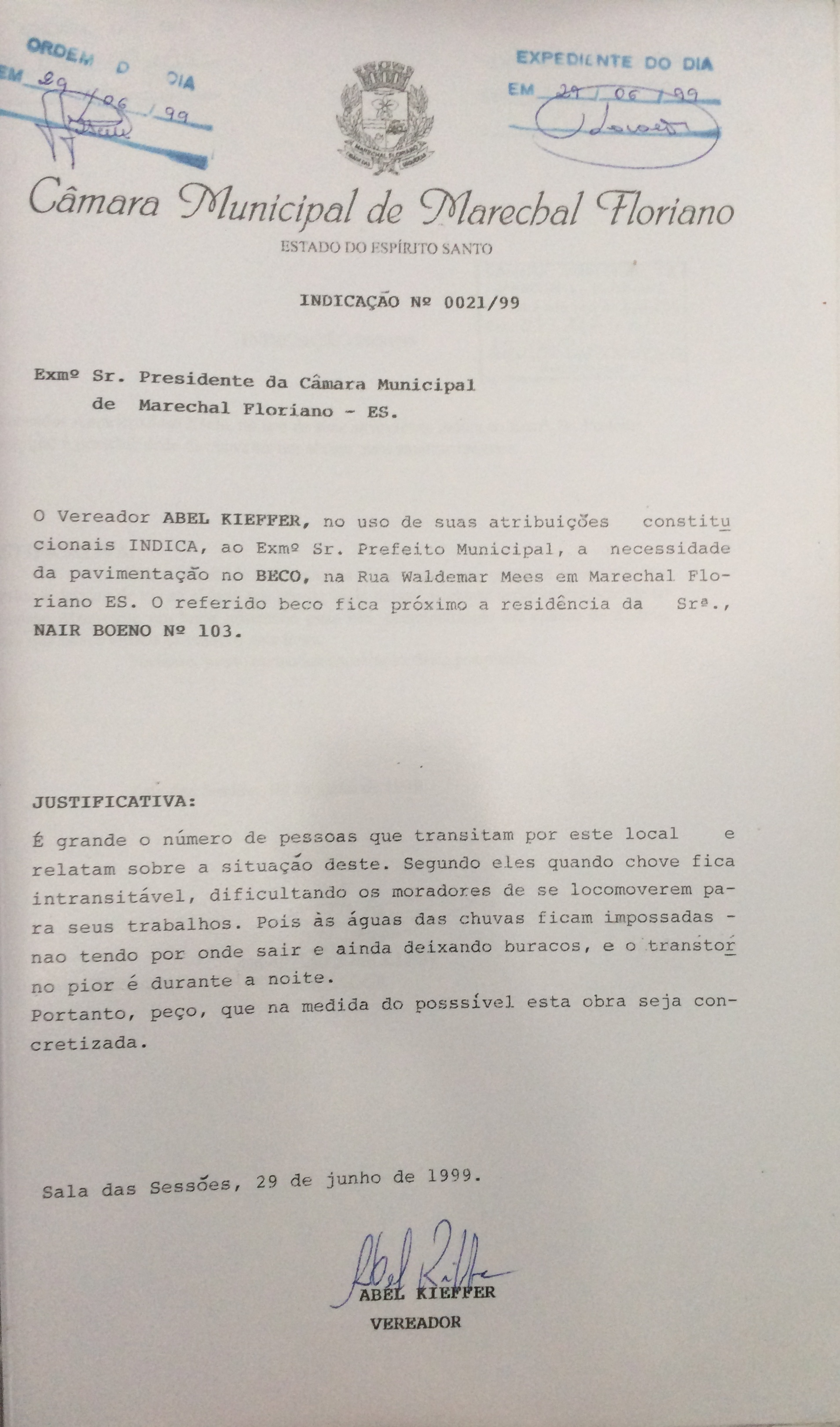 Ementa: INDICA A NECESSIDADE DE PAVIMENTAÇÃO NO BECO, NA RUA WALDEMAR MEES EM MARECHAL FLORIANO-ES O REFERIDO BECO FICA PRÓXIMO A RESIDÊNCIA DA SRª NAIR BOENO N°103.
