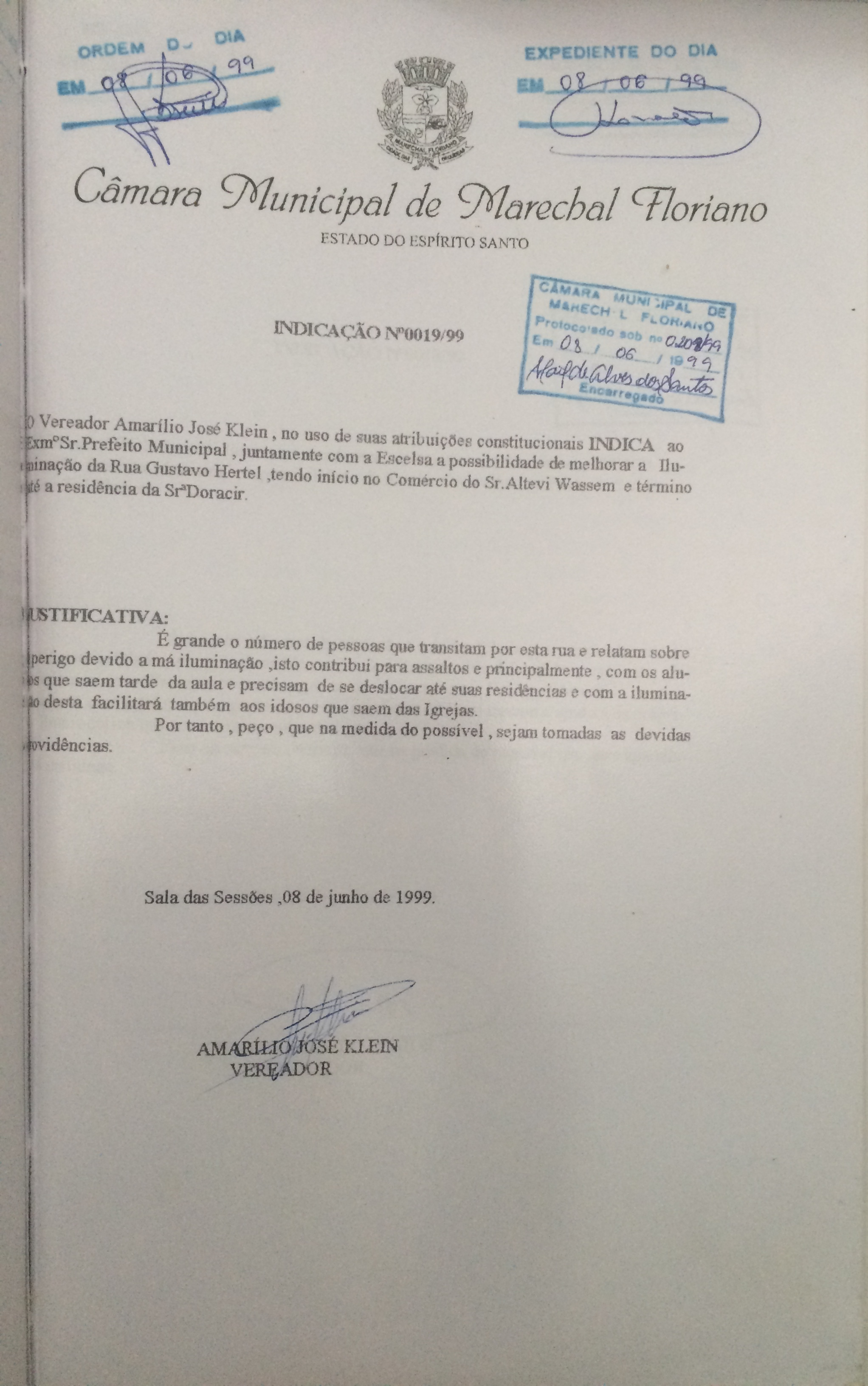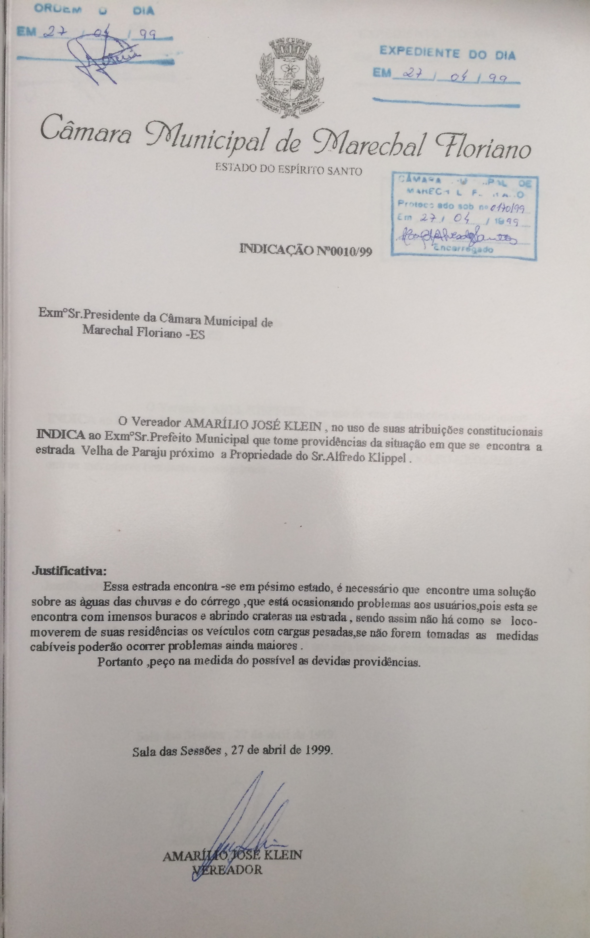 Ementa: INDICA QUE TOME PROVIDÊNCIA DA SITUAÇÃO EM QUE SE ENCONTRA A ESTRADA VELHA DE PARAJU PRÓXIMO A PROPRIEDADE DO SR. ALFREDO KLIPPEL.