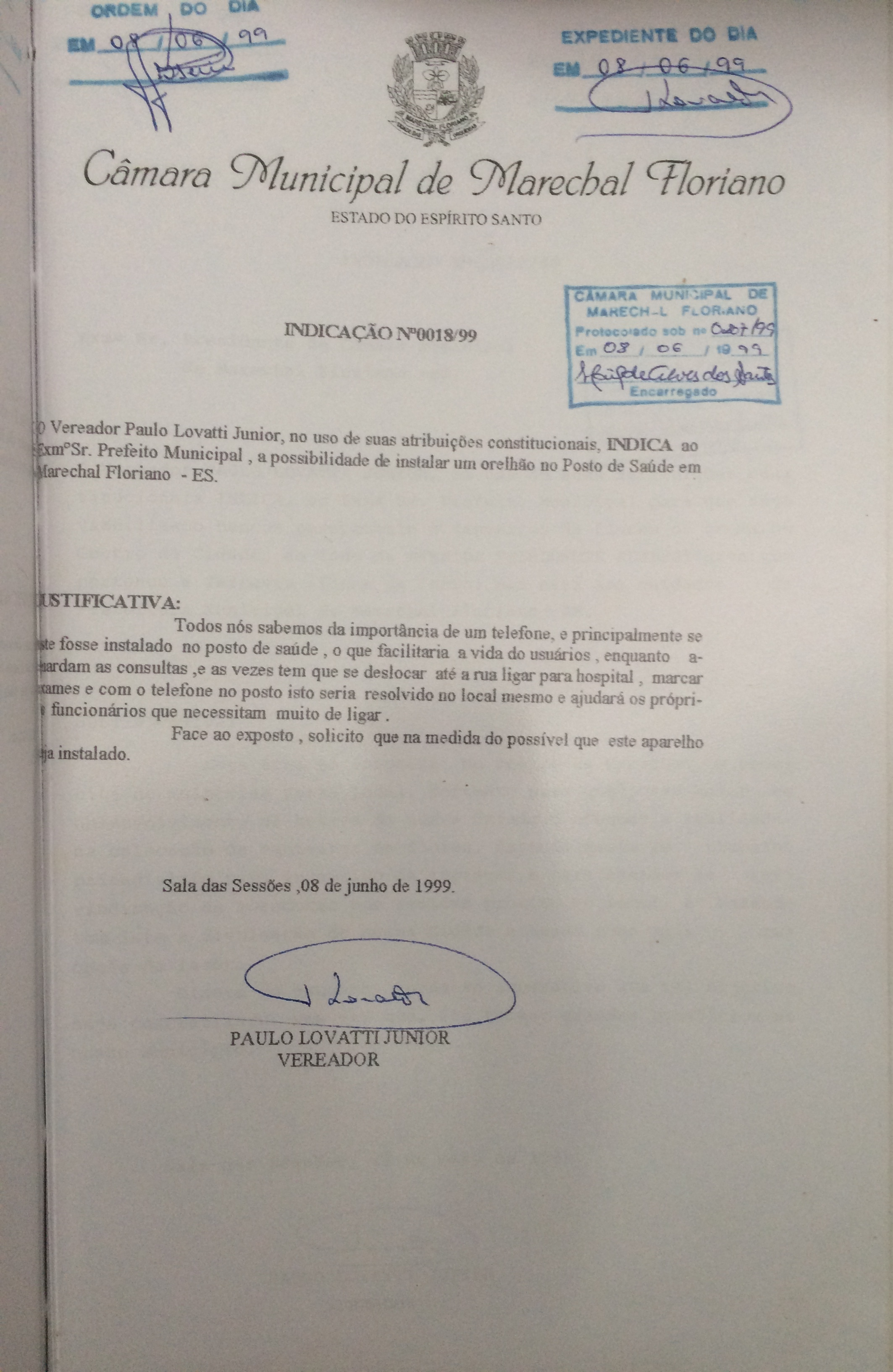Ementa: INDICA A POSSIBILIDADE DE INSTALAR UM ORELHÃO NO POSTO DE SAÚDE EM MARECHAL FLORIANO-ES.