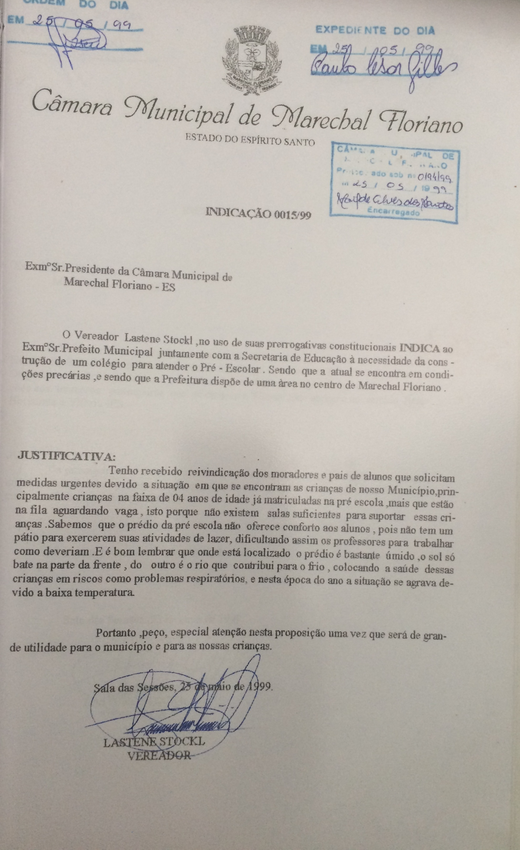 Ementa: INDICA A NECESSIDADE DE CONSTRUÇÃO DE UM COLÉGIO PARA ATENDER O PRÉ ESCOLAR. SENDO QUE A ATUAL SE ENCONTRA EM CONDIÇÕES PRECÁRIAS E SENDO QUE A PREFEITURA DISPÕE DE UMA ÁREA NO CENTRO DE MARECHAL FLORIANO.