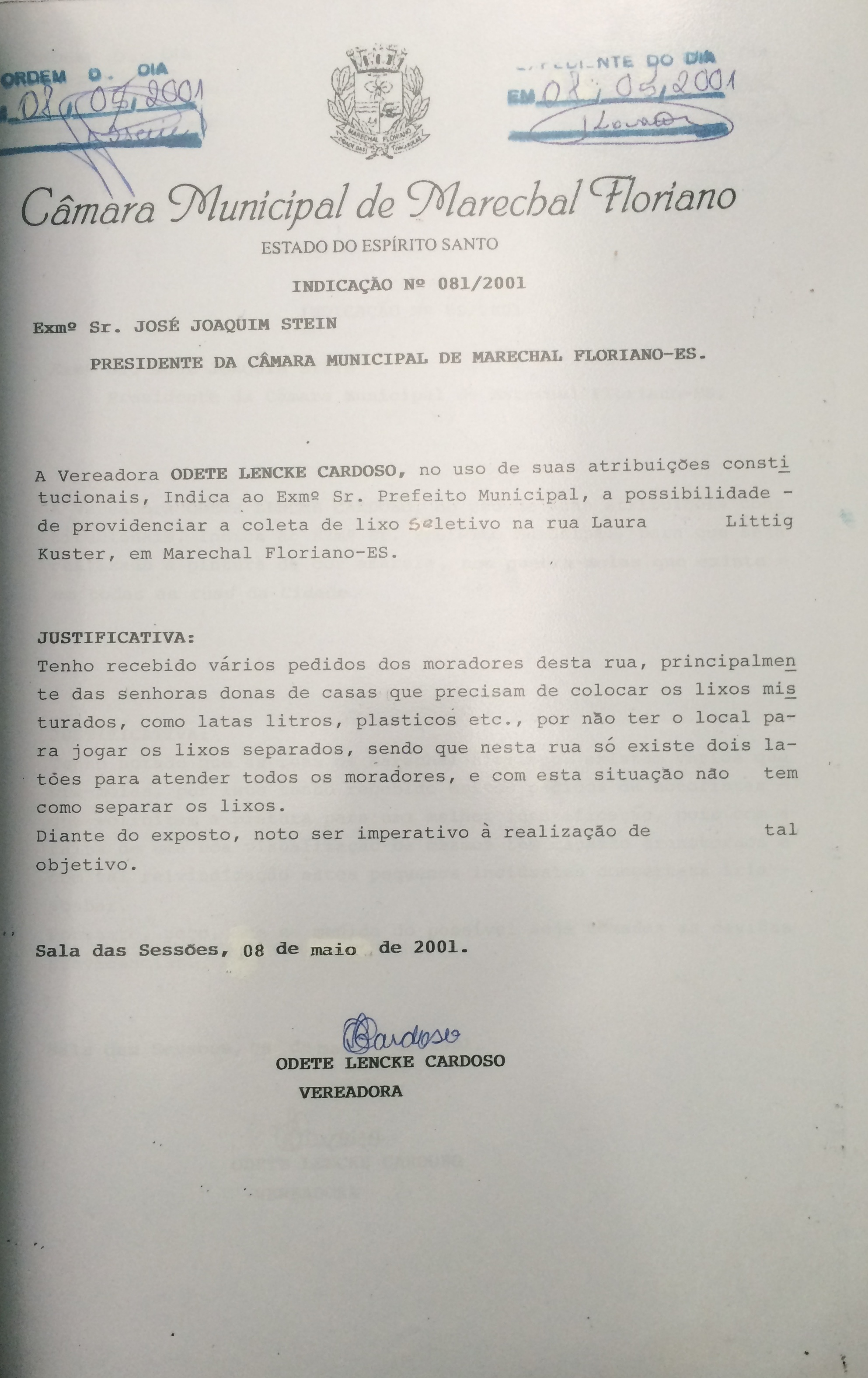 Ementa: INDICA A POSSIBILIDADE DE PROVIDENCIAR A COLETA DE LIXO SELETIVO NA RUA LAURA LITTIG KUSTER, EM MARECHAL FLORIANO-ES.