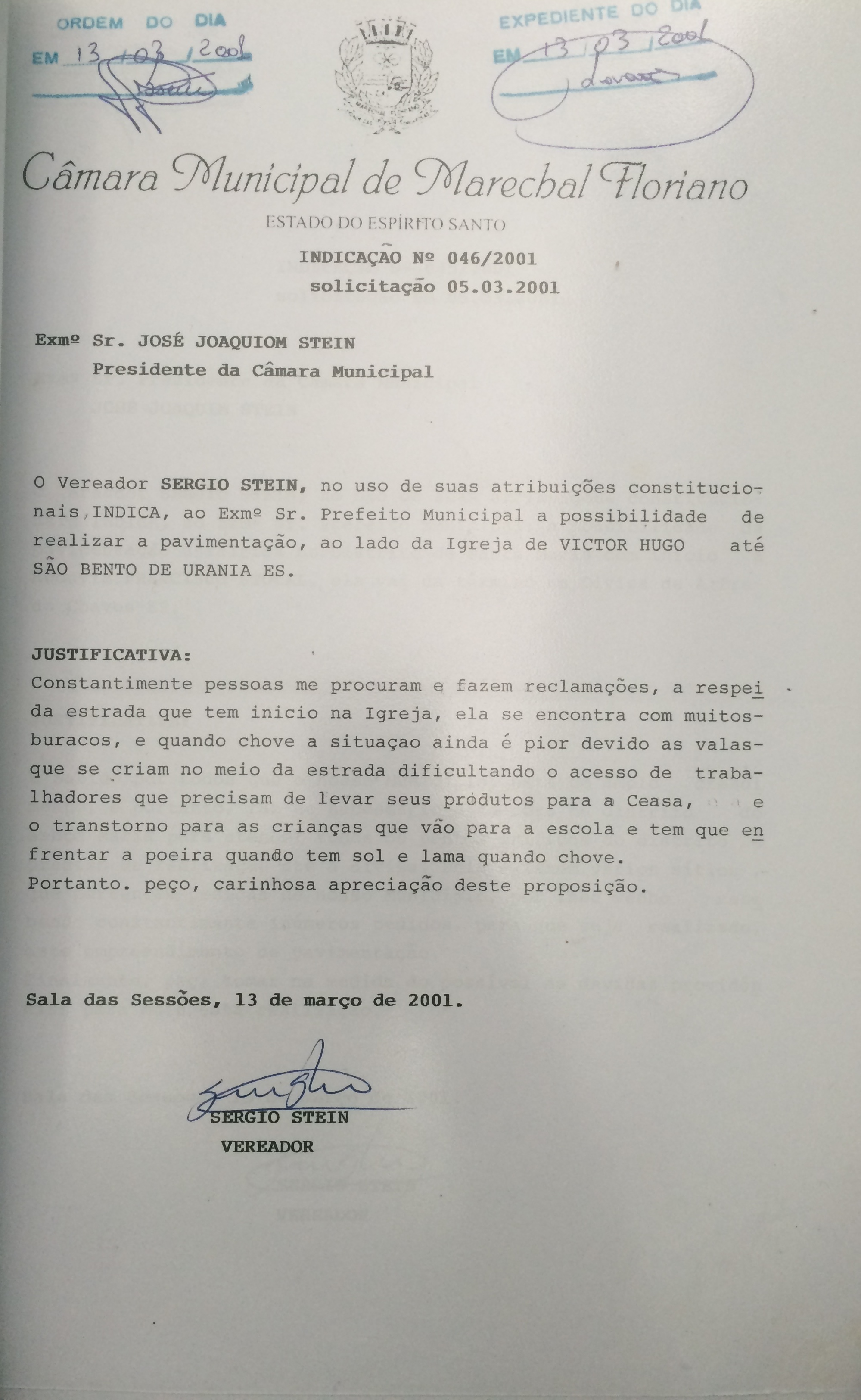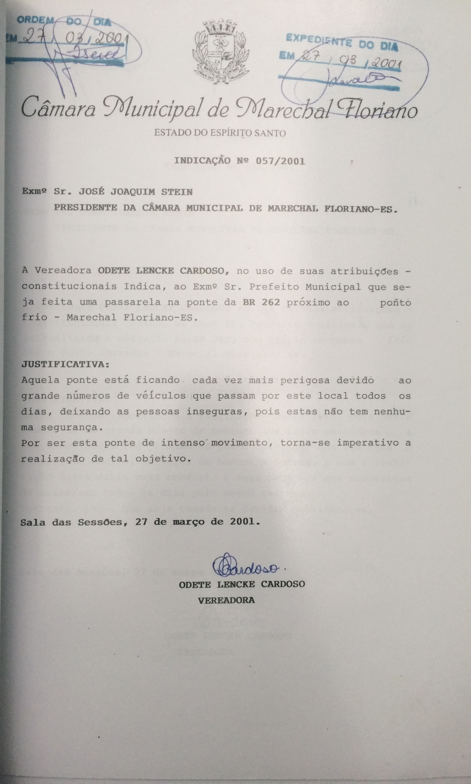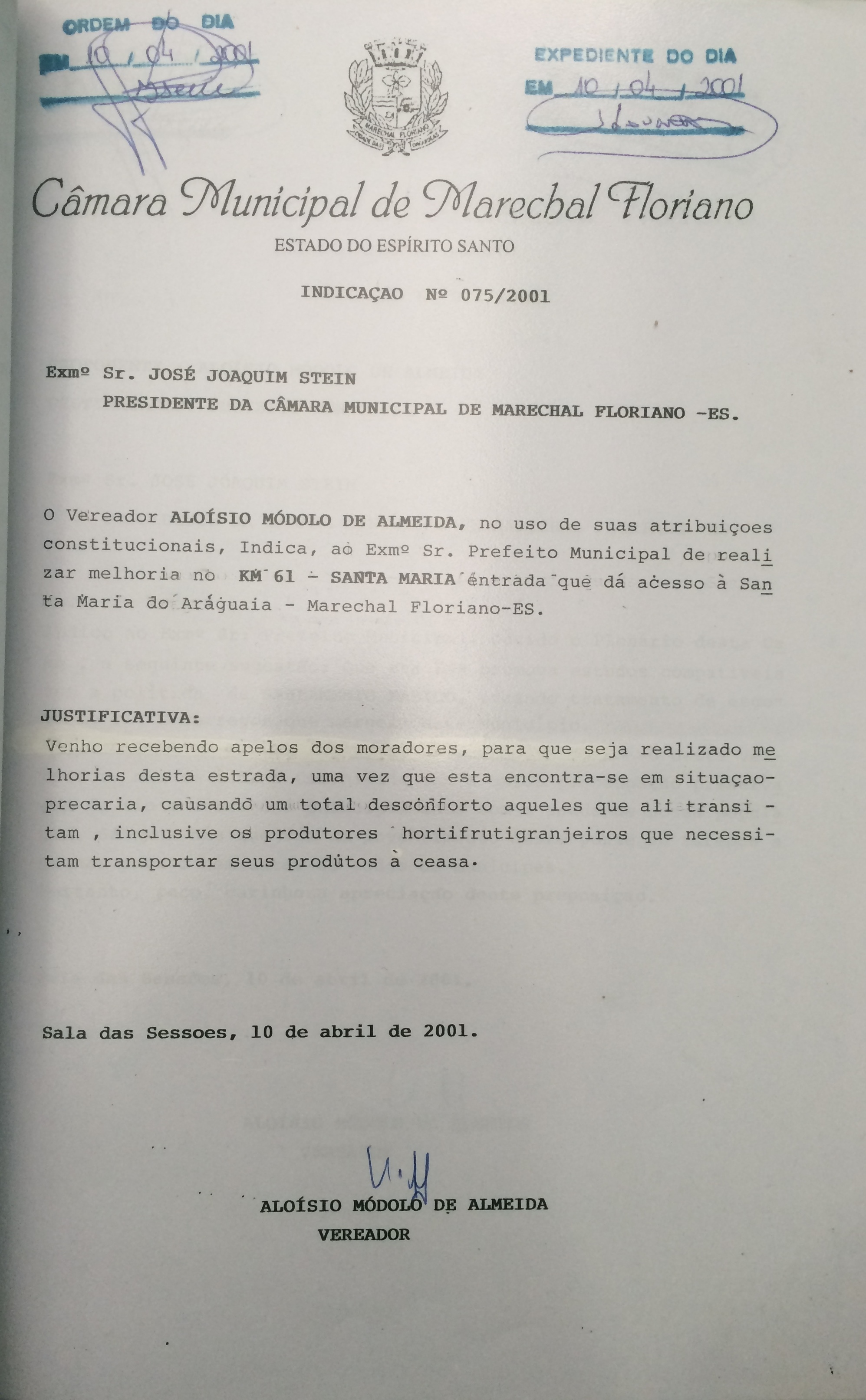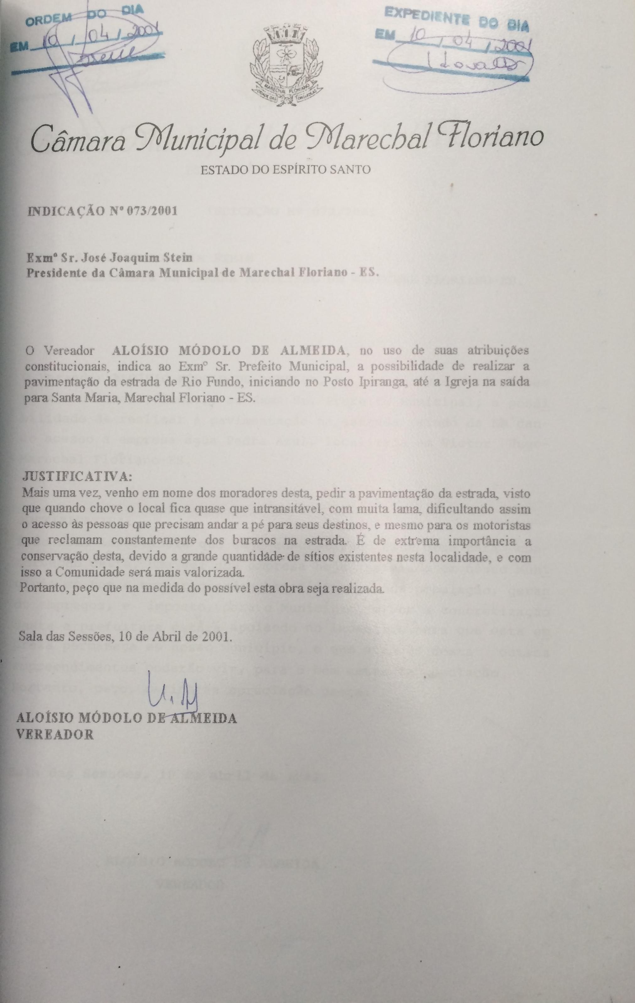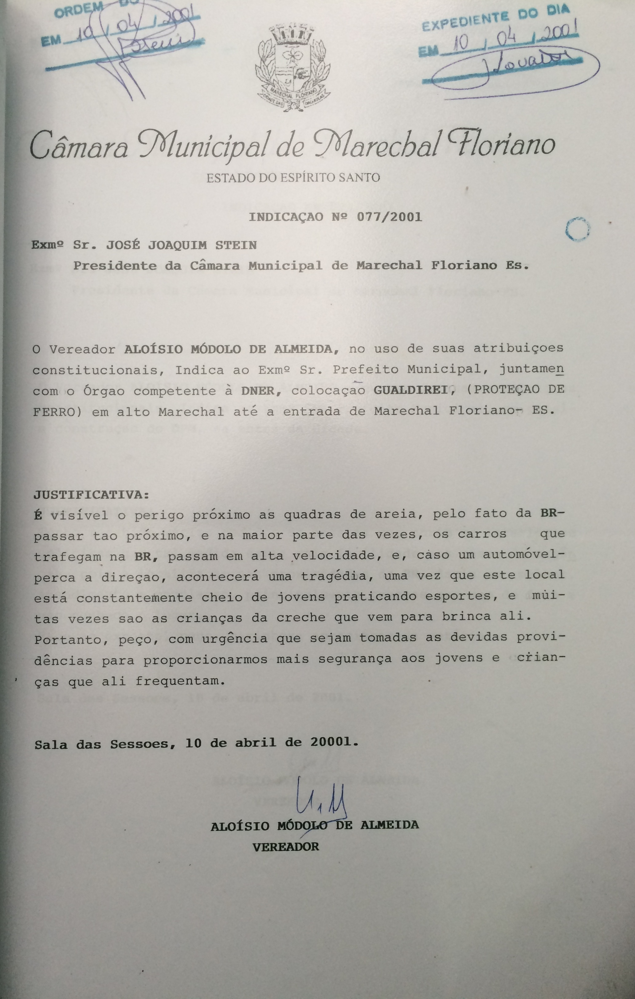 Ementa: INDICA A COLOCAÇÃO GUALDIREI, (PROTEÇÃO DE FERRO), EM ALTO MARECHAL ATÉ A ENTRADA DE MARECHAL FLORIANO-ES.