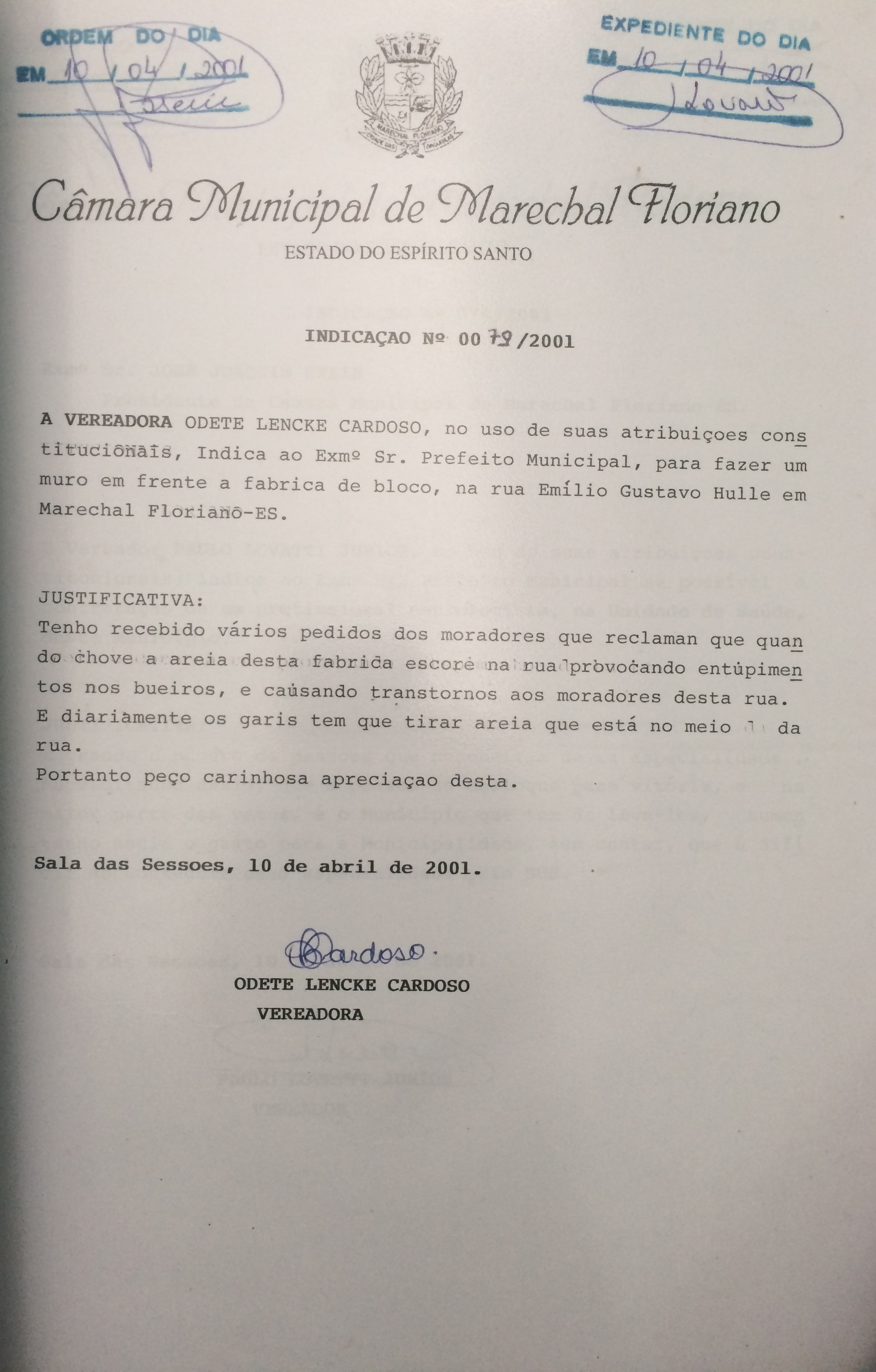 Ementa: INDICA PARA FAZER UM MURO EM FRENTE A FABRICA DE BLOCO, NA RUA EMÍLIO GUSTAVO HULLE EM MARECHAL FLORIANO-ES.