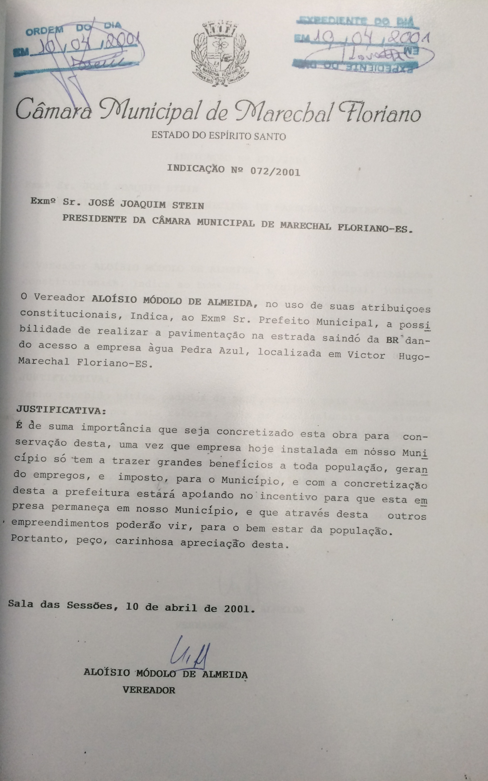 Ementa: INDICA A POSSIBILIDADE DE REALIZAR A PAVIMENTAÇÃO NA ESTRADA SAINDO DA BR DANDO ACESSO A EMPRESA ÁGUA PEDRA AZUL, LOCALIZADA EM VICTOR HUGO-MARECHAL FLORIANO-ES.