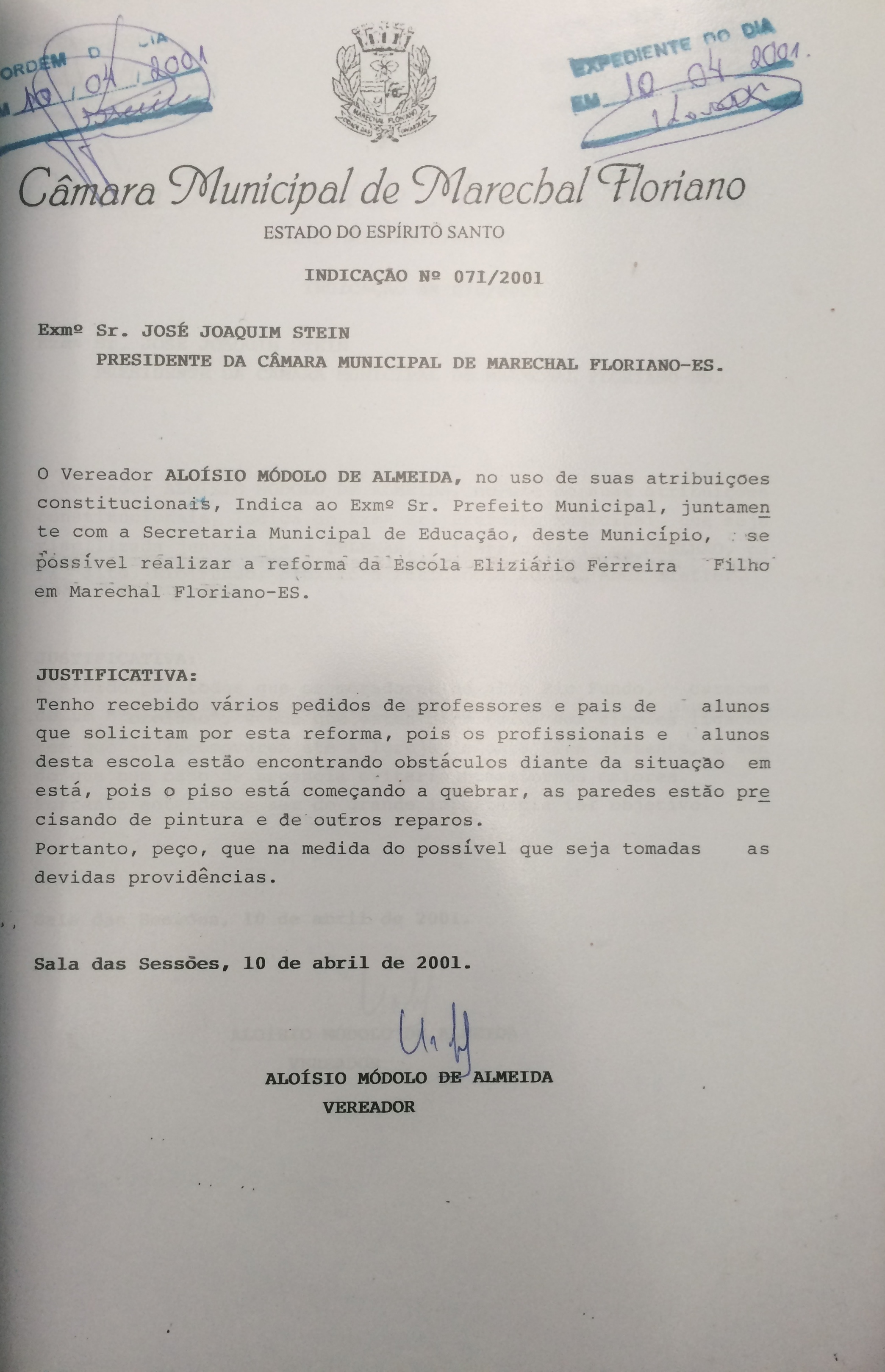 Ementa: INDICA SE POSSÍVEL REALIZAR A REFORMA DA ESCOLA ELIZIÁRIO FERREIRA FILHO EM MARECHAL FLORIANO-ES.