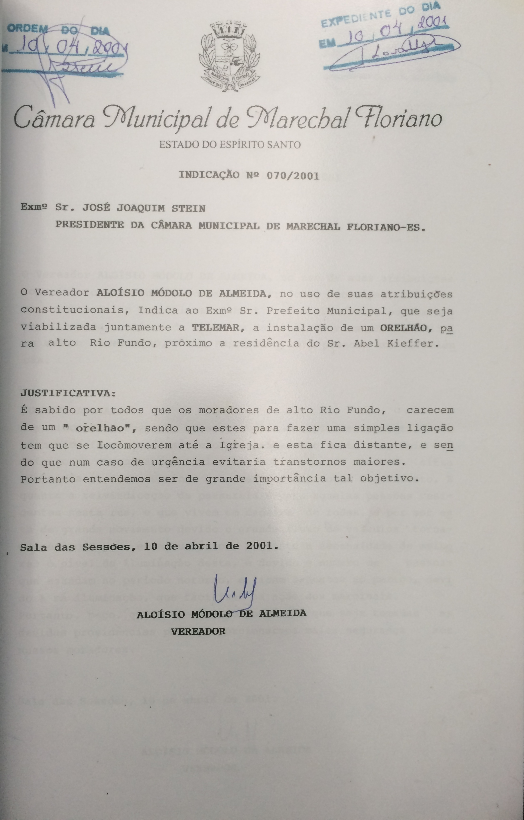 Ementa: INDICA QUE SEJA VIABILIZADA JUNTAMENTE COM A TELEMAR, A INSTALAÇÃO DE UM ORELHÃO, PARA ALTO RIO FUNDO, PRÓXIMO A RESIDÊNCIA DO SR. ABEL KIEFFER.