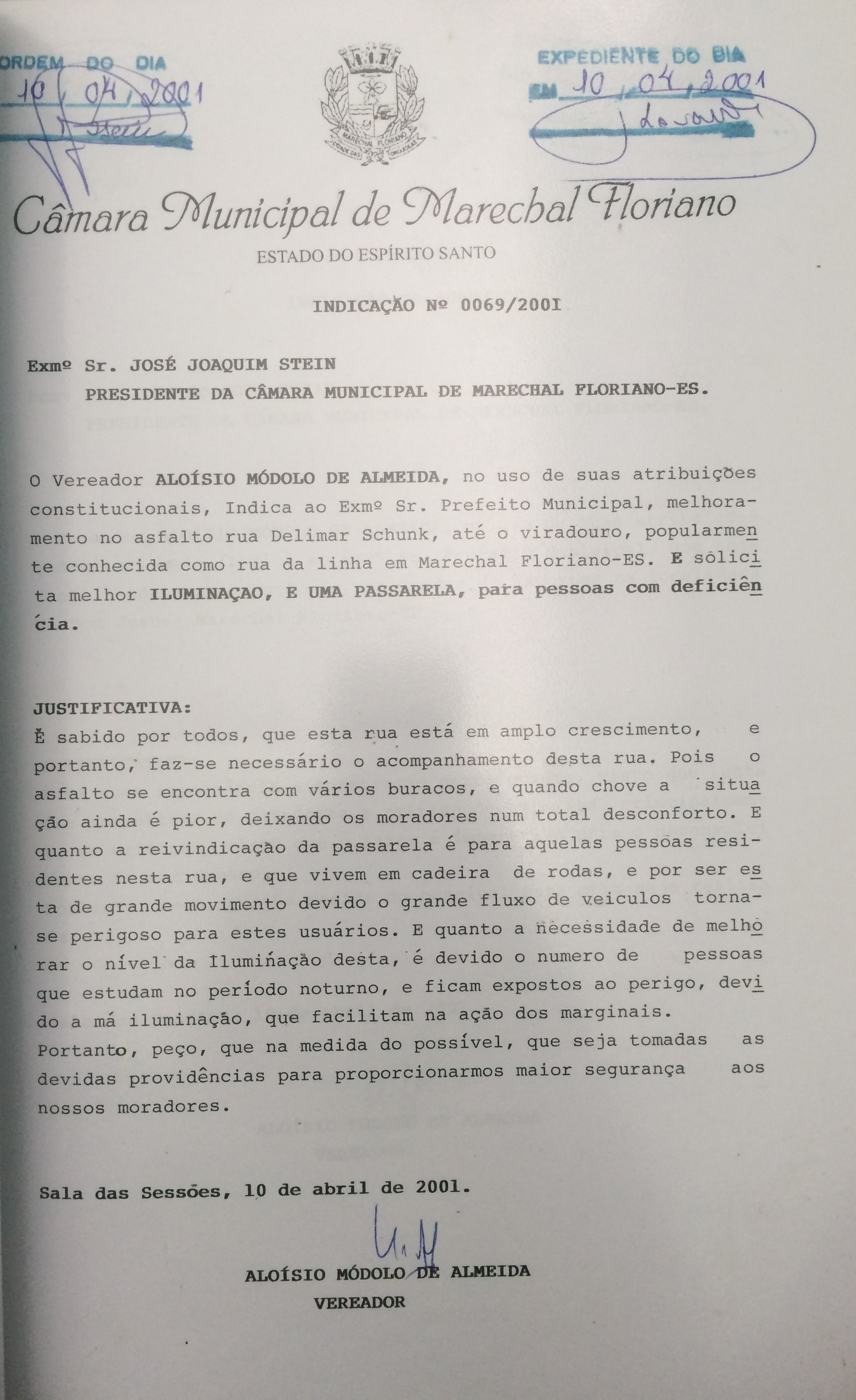 Ementa: INDICA MELHORAMENTO NO ASFALTO RUA DELIMAR SCHUNK, ATÉ VIRADOURO, POPULARMENTE CONHECIDA COMO RUA DA LINHA EM MARECHAL FLORIANO-ES. E SOLICITA MELHOR ILUMINAÇÃO, E UMA PASSARELA, PARA PESSOAS COM DEFICIÊNCIA.