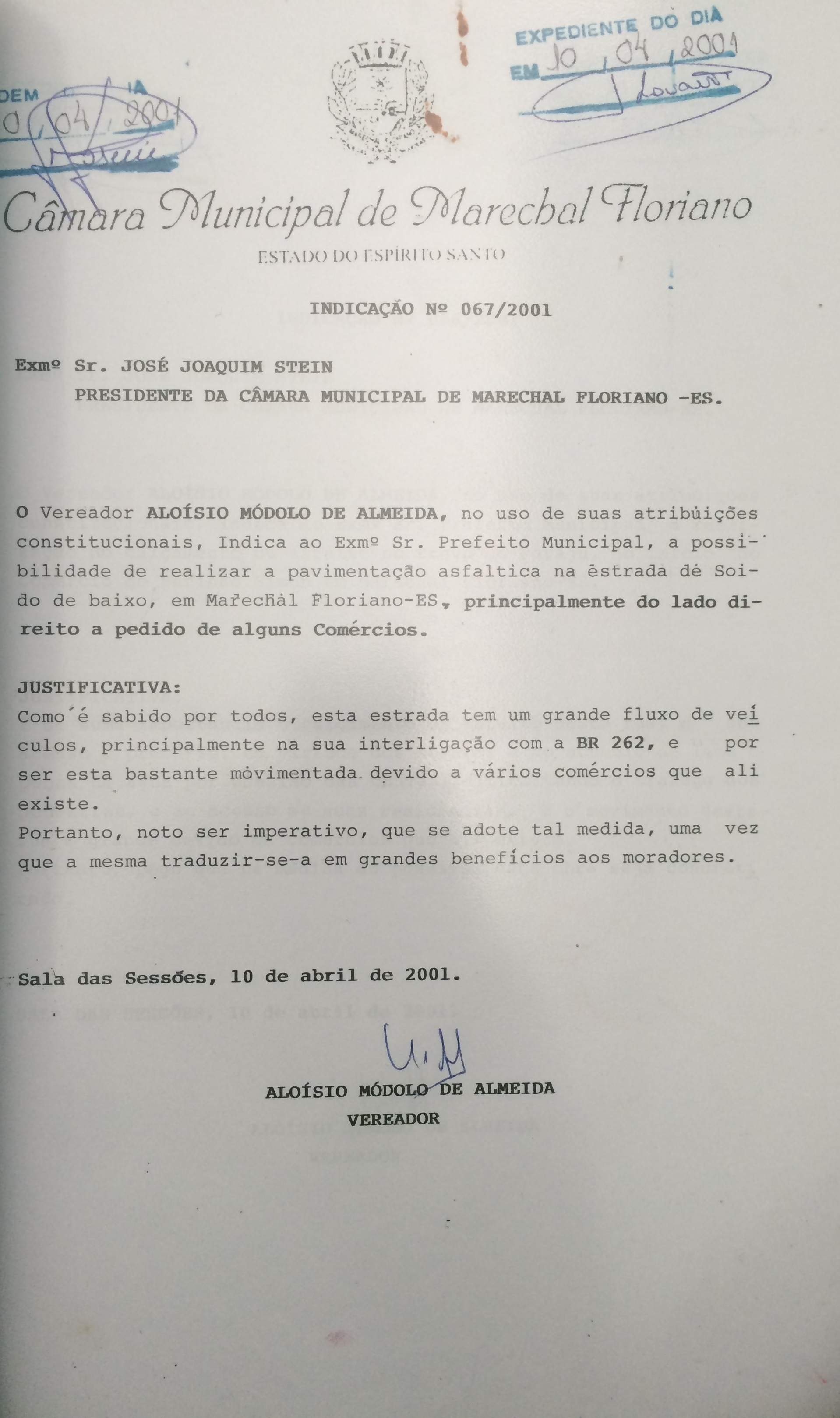Ementa: INDICA A POSSIBILIDADE DE REALIZAR A PAVIMENTAÇÃO ASFÁLTICA NA ESTRADA DE SOÍDO DE BAIXO, EM MARECHAL FLORIANO-ES, PRINCIPALMENTE DO LADO DIREITO A PEDIDO DE ALGUNS COMÉRCIOS.