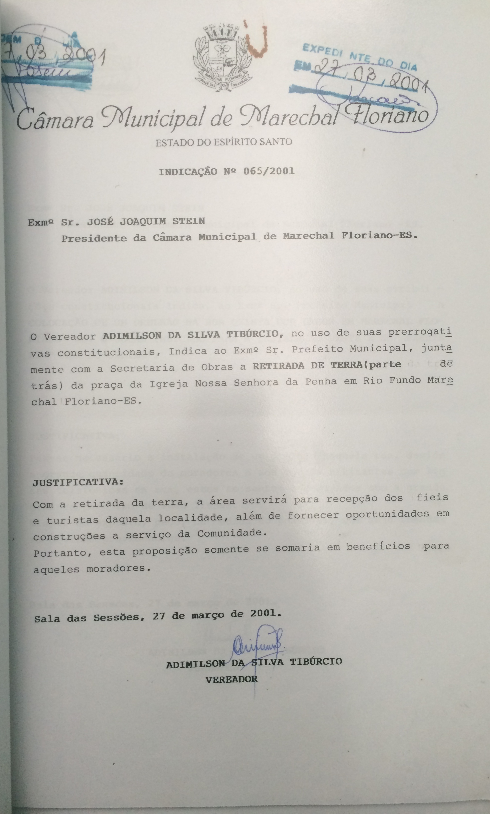 Ementa: INDICA A RETIRADA DE TERRA (PARTE DE TRÁS) DA PRAÇA DA IGREJA NOSSA SENHORA DA PENHA EM RIO FUNDO MARECHAL FLORIANO-ES.