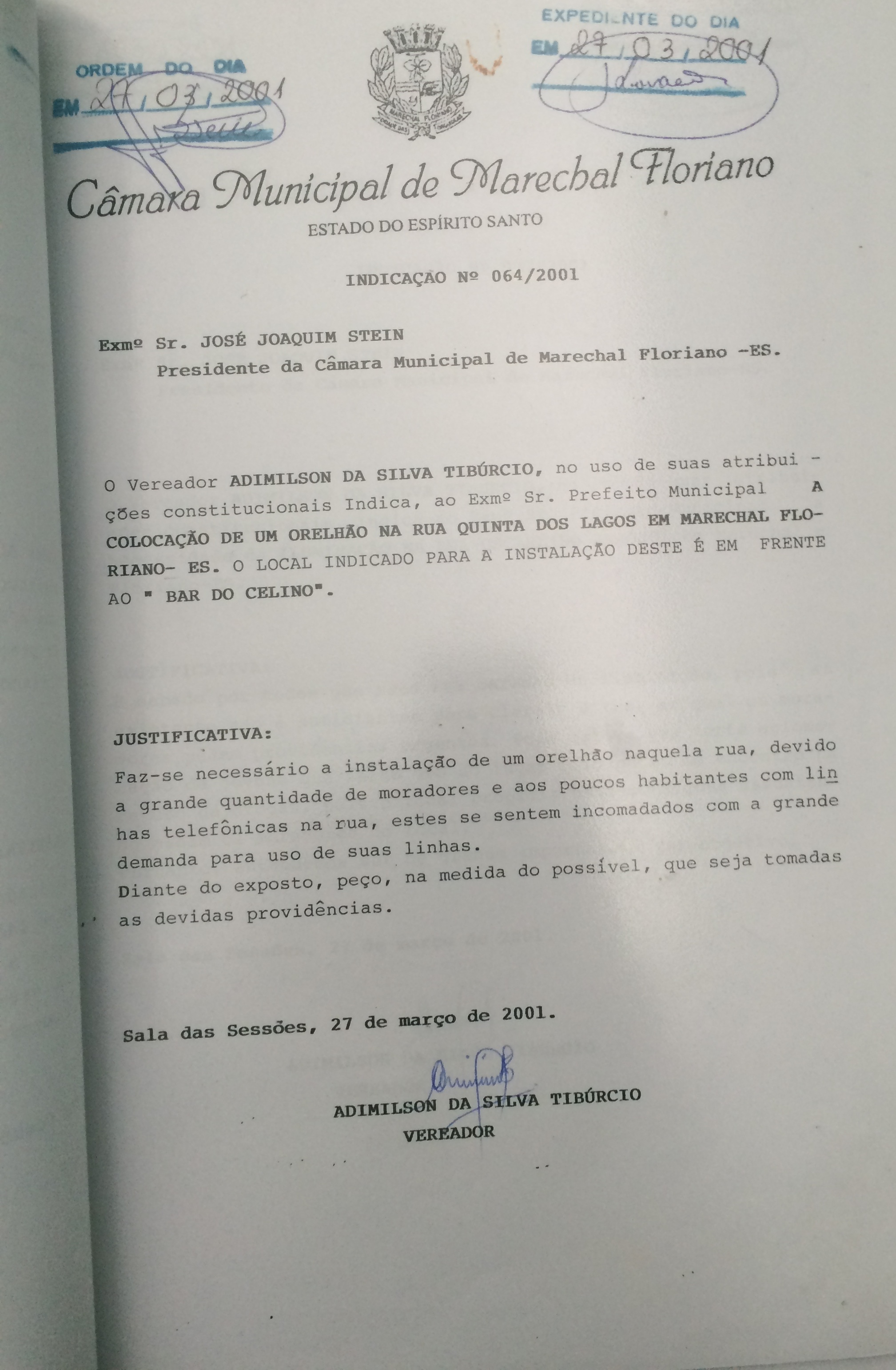 Ementa: INDICA A COLOCAÇÃO DE UM ORELHÃO NA RUA QUINTA DOS LAGO EM MARECHAL FLORIANO-ES. O LOCAL INDICADO PARA A INSTALAÇÃO DESTE É EM FRENTE AO BAR DO CELINO.