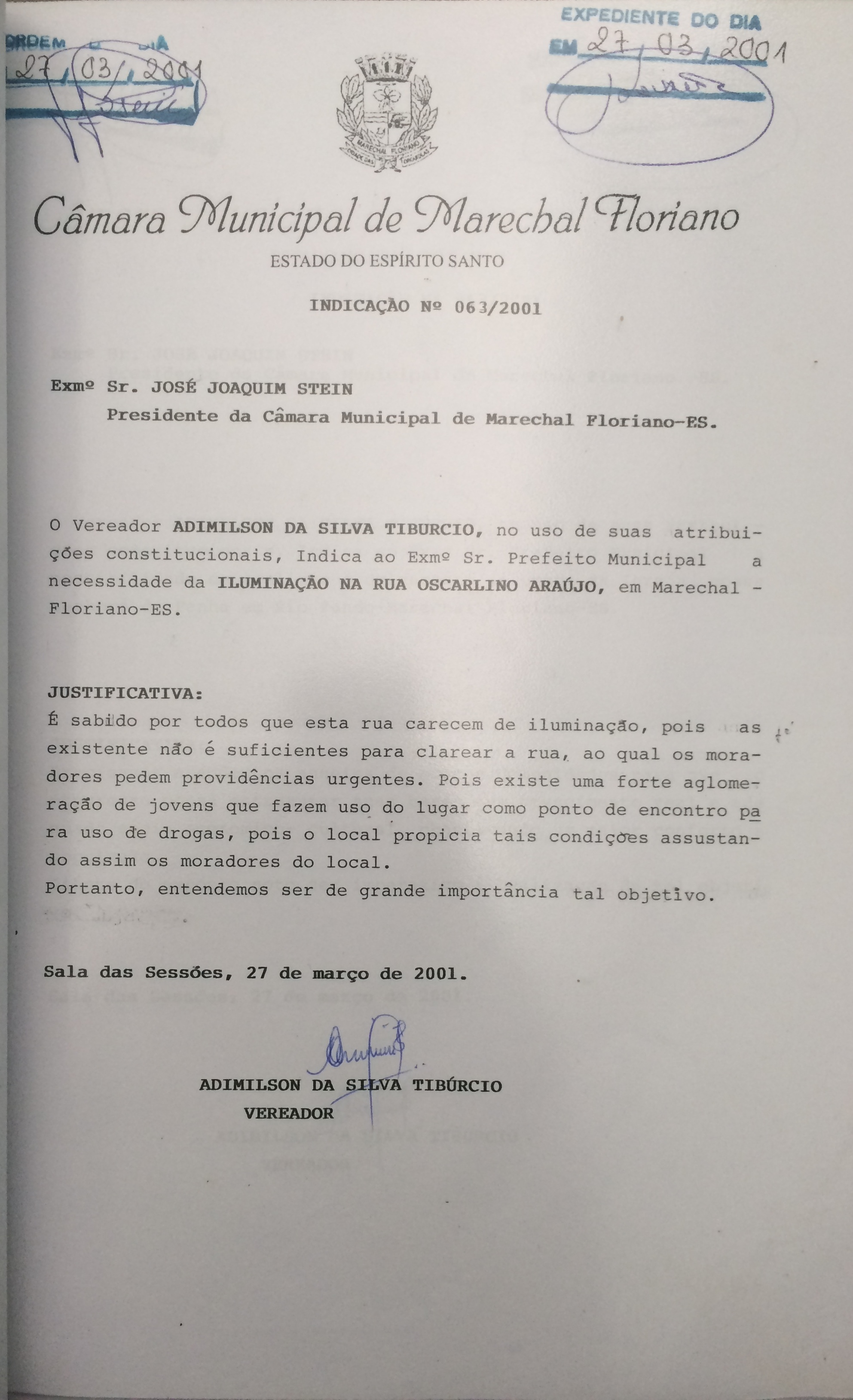 Ementa: INDICA A NECESSIDADE DA ILUMINAÇÃO NA RUA OSCARLINO ARAÚJO, EM MARECHAL FLORIANO-ES.
