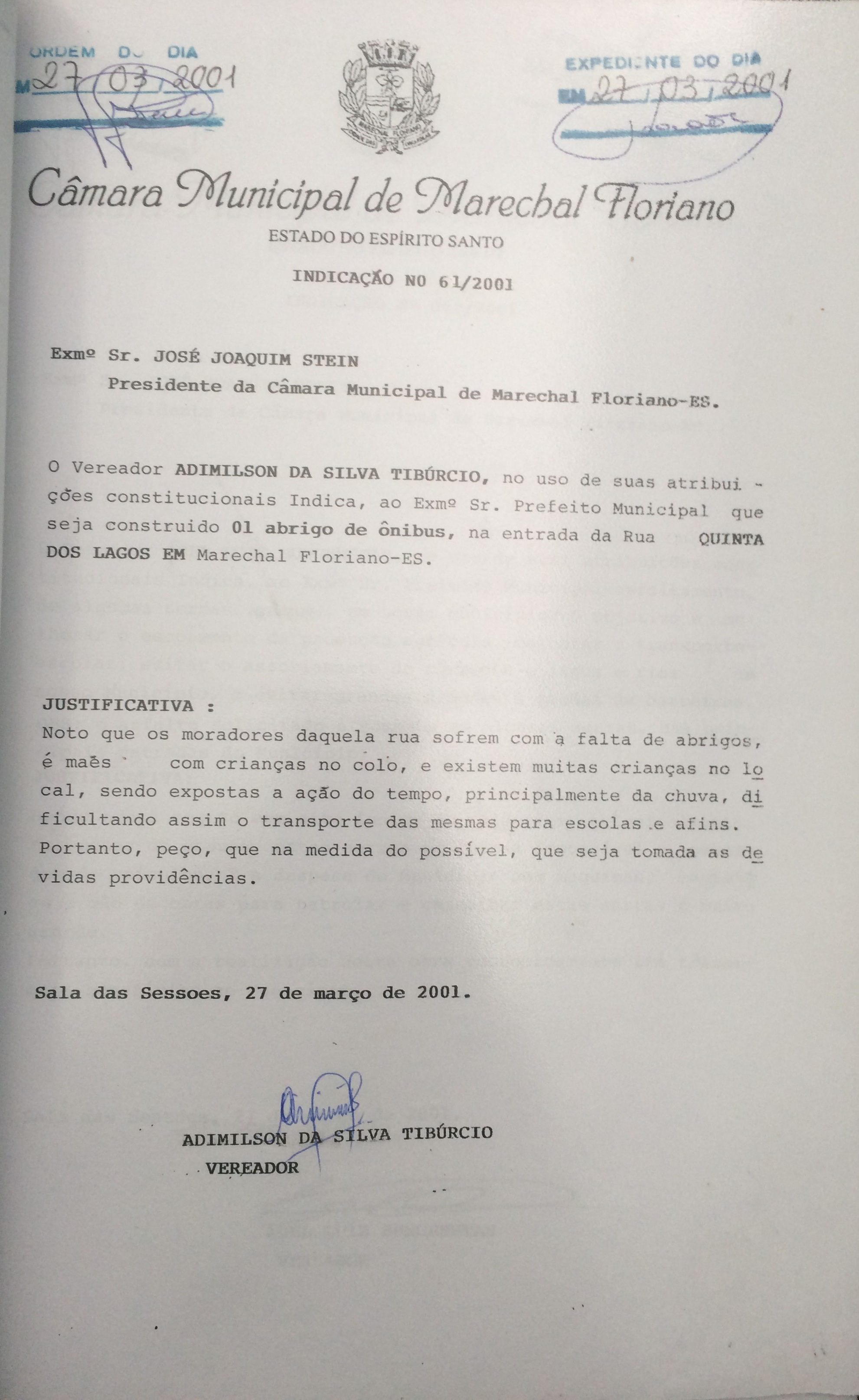 Ementa: INDICA QUE SEJA CONSTRUÍDO 01 ABRIGO DE ÔNIBUS, NA ESTRADA A RUA QUINTA DOS LAGOS EM MARECHAL FLORIANO-ES.