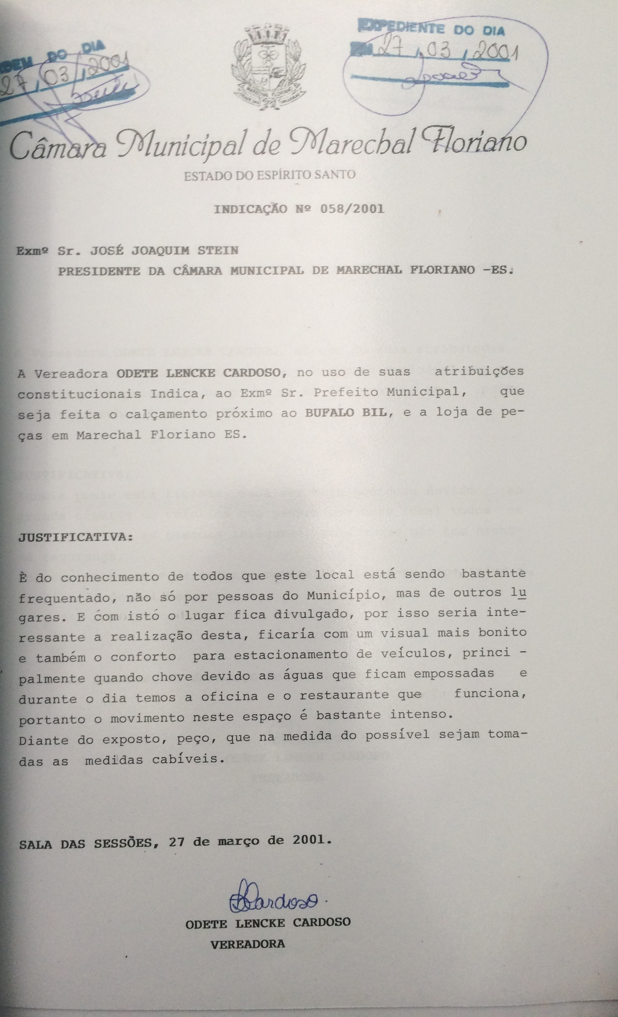 Ementa: INDICA QUE SEJA FEITA O CALÇAMENTO PRÓXIMO AO BUFALO BIL, E ALIJA DE PEÇAS EM MARECHAL FLORIANO-ES.